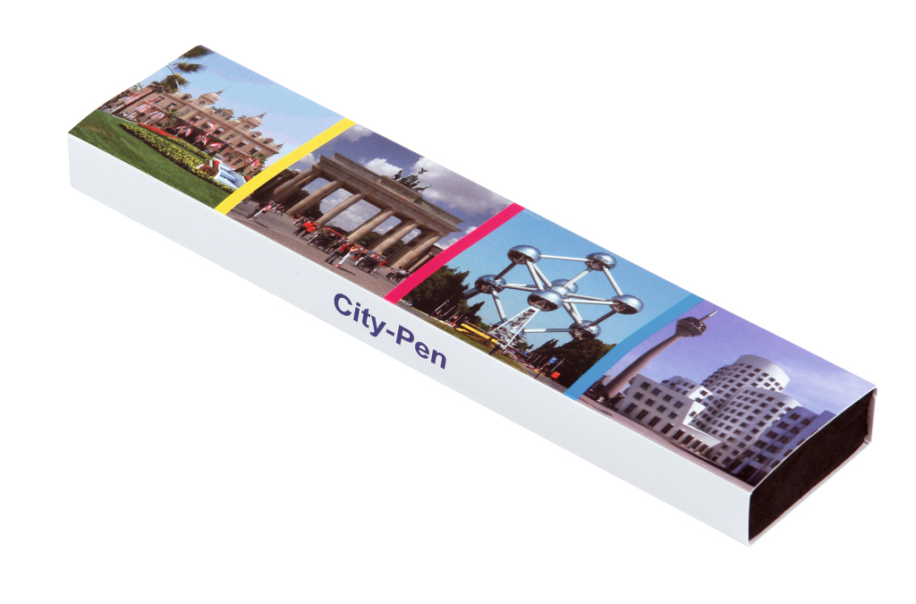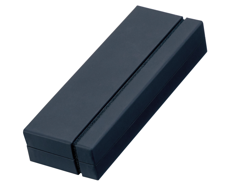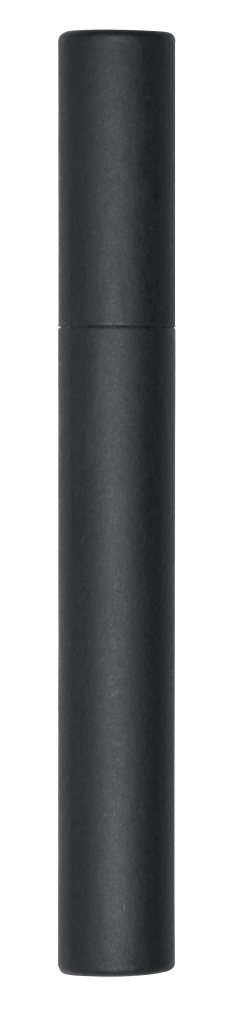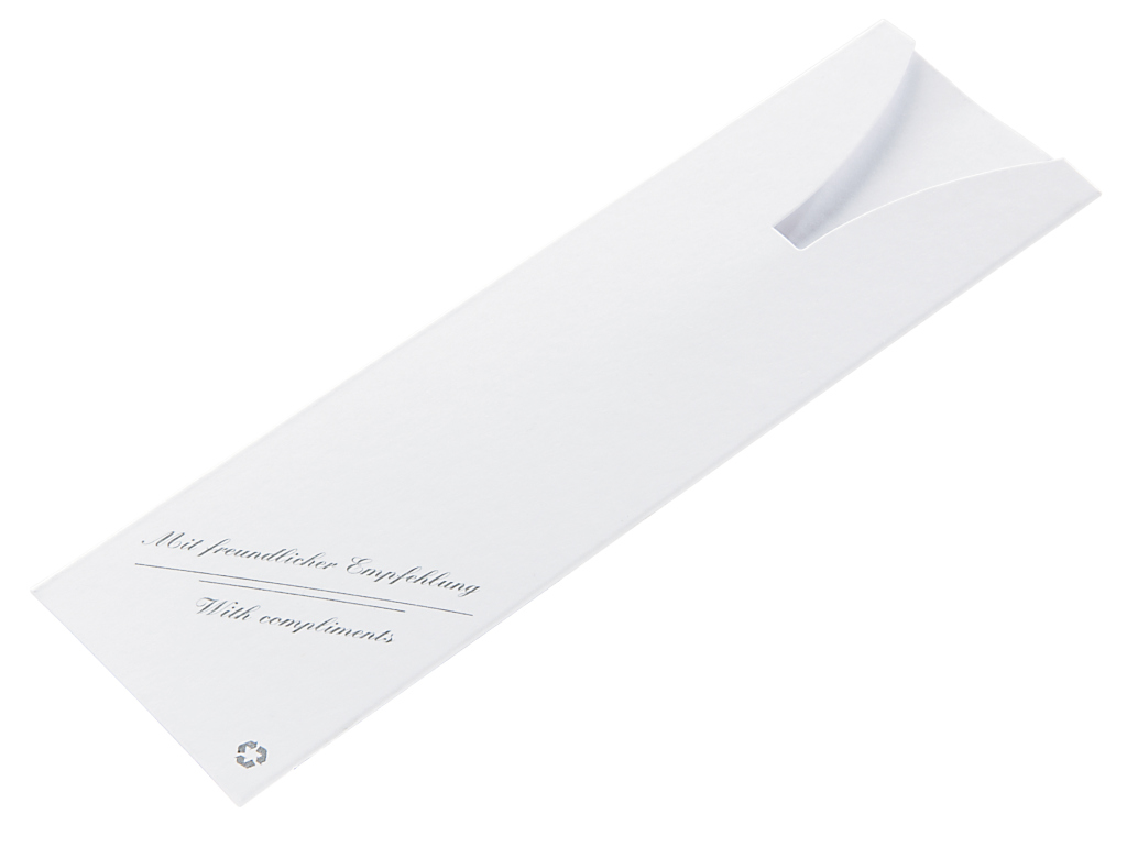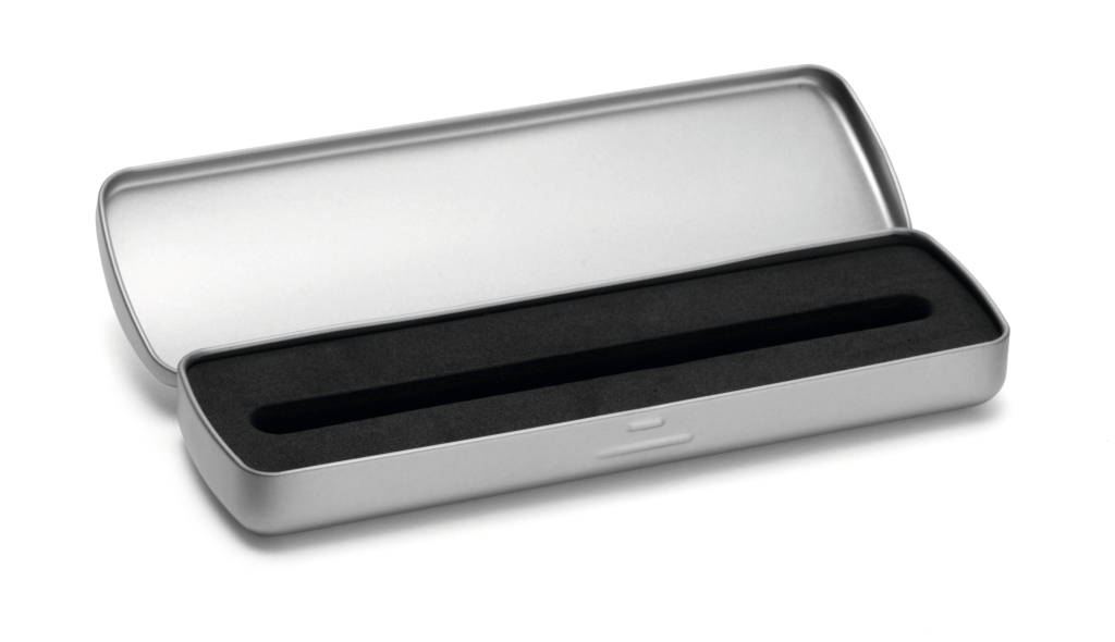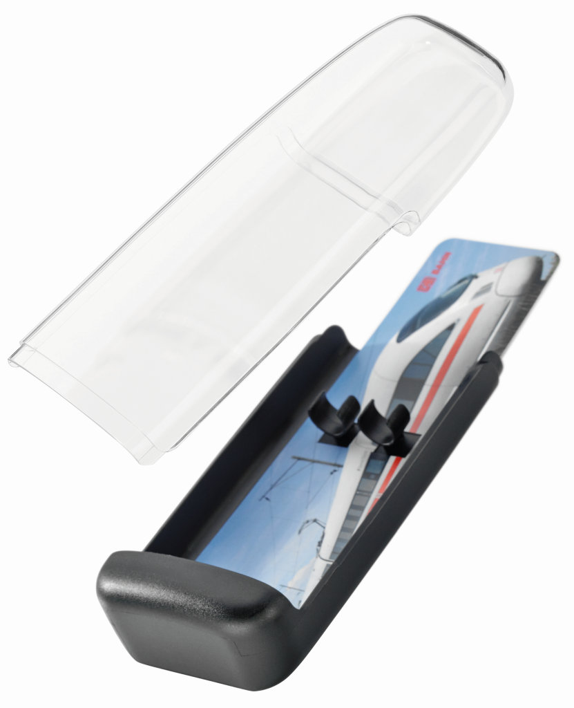 Kunststoff-Etui mit transparentem Deckel und schwarzem Boden. Incl. beidseitig bedrucktem Einleger für 2 Schreibgeräte.