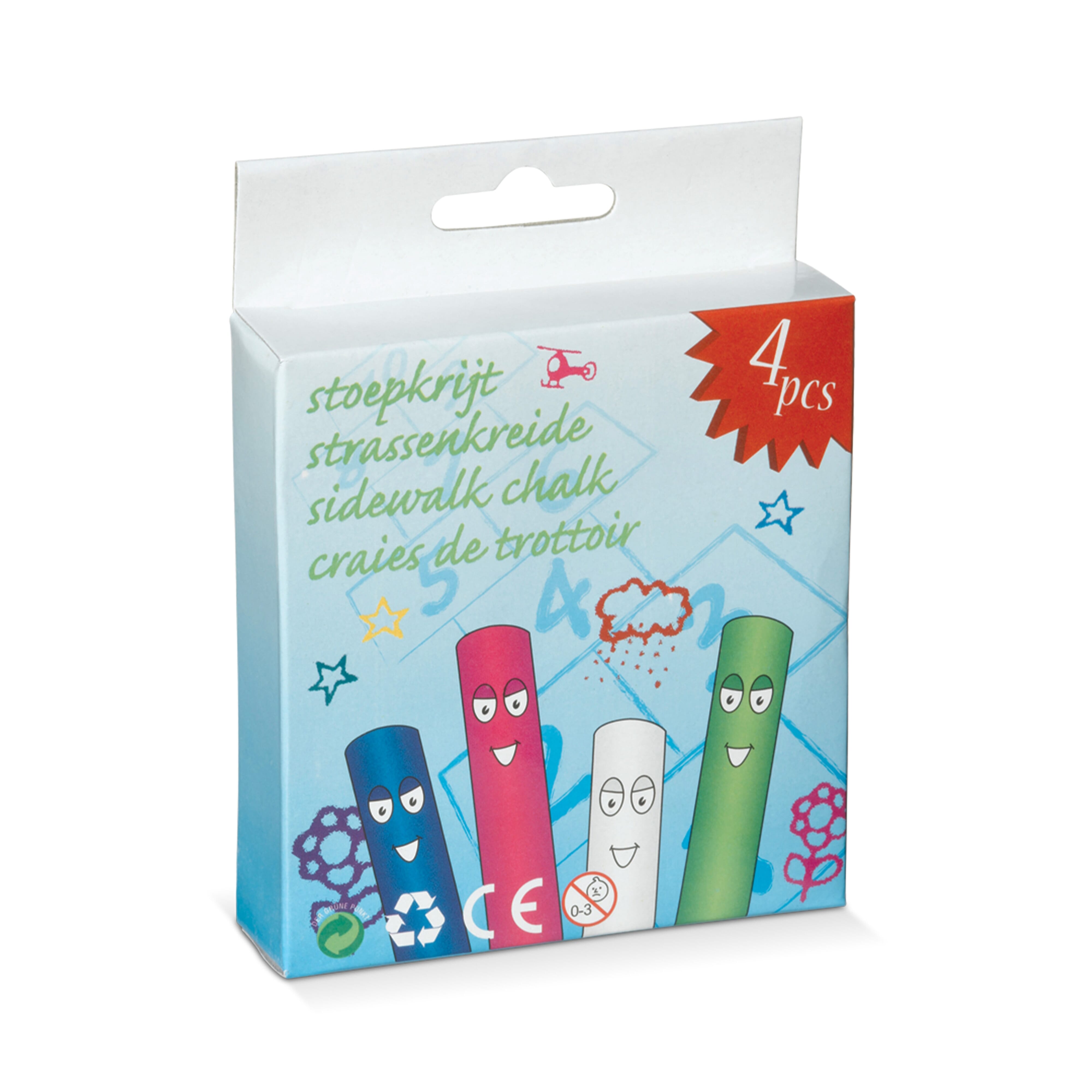 <p>4 Stück Straßenkreide in einer bunten Kartonverpackung. Ideal als Werbegeschenk für Kinder. Ab 250 Stück kann die Verpackung individuell gestaltet werden. Rufen Sie dafür den Artikel LT90403 auf. Fragen Sie nach den Möglichkeiten.</p><ul><li>Geschenkverpackung: Ja</li><li>Standardschreibfarben: weiß, pink, blau, grün</li></ul>