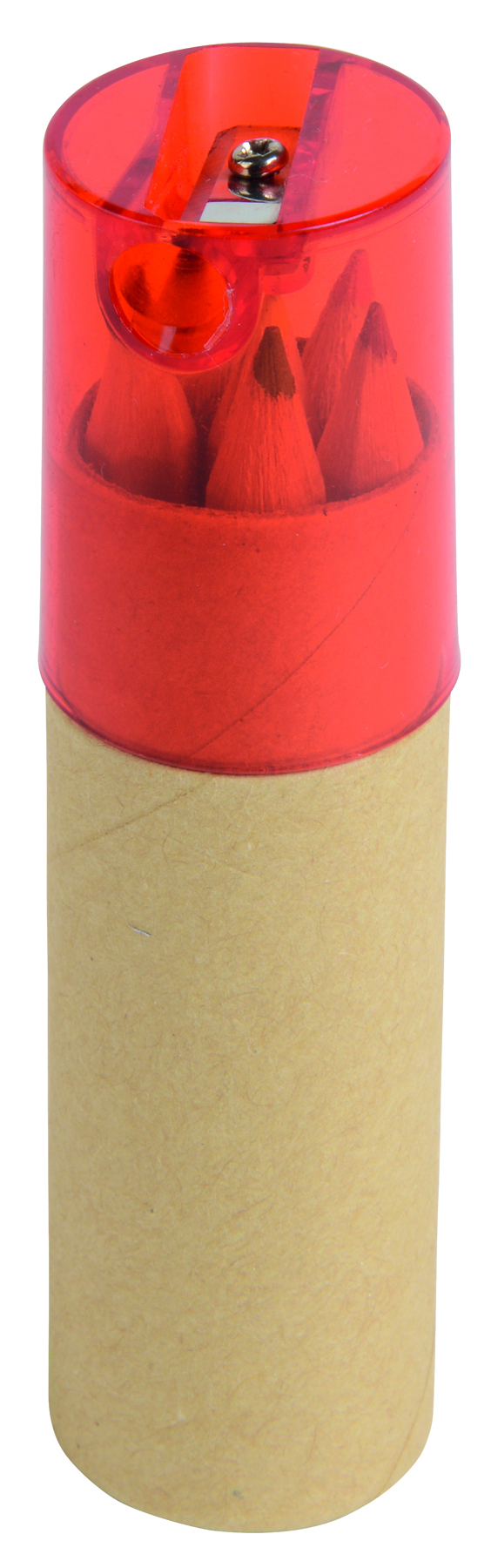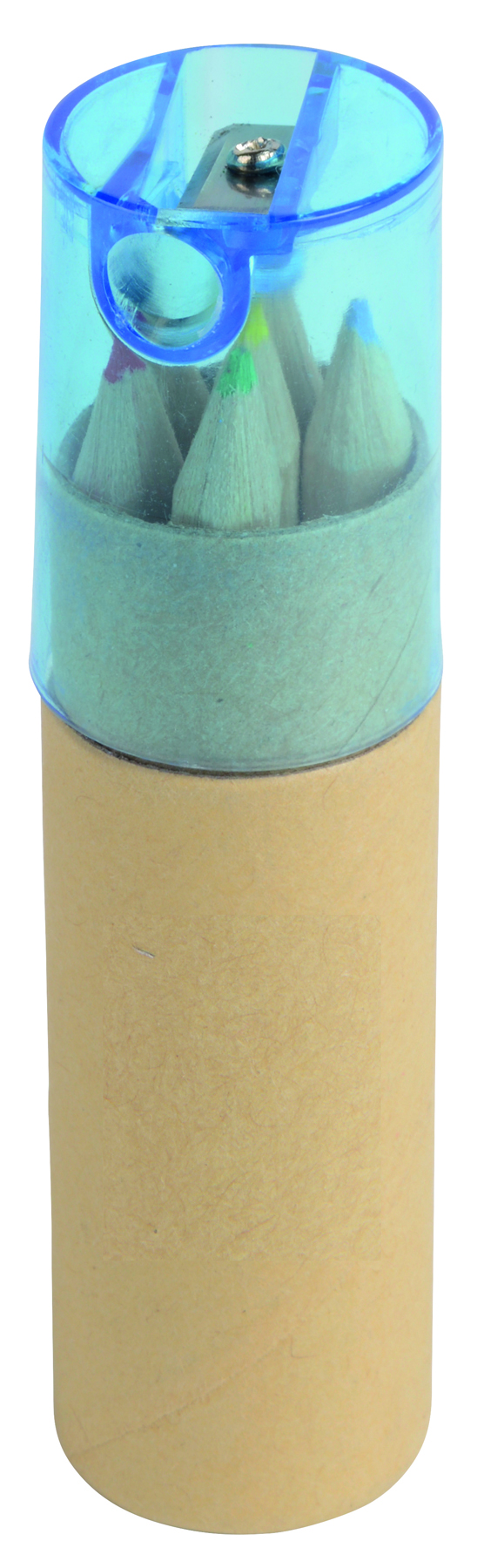 Stifte-Set SMALL CIRCLE , 7-teilig: 6 verschiedenfarbige Naturholz-Buntstifte, angespitzt, in runder Box, integrierter Anspitzer im transparenten Deckel