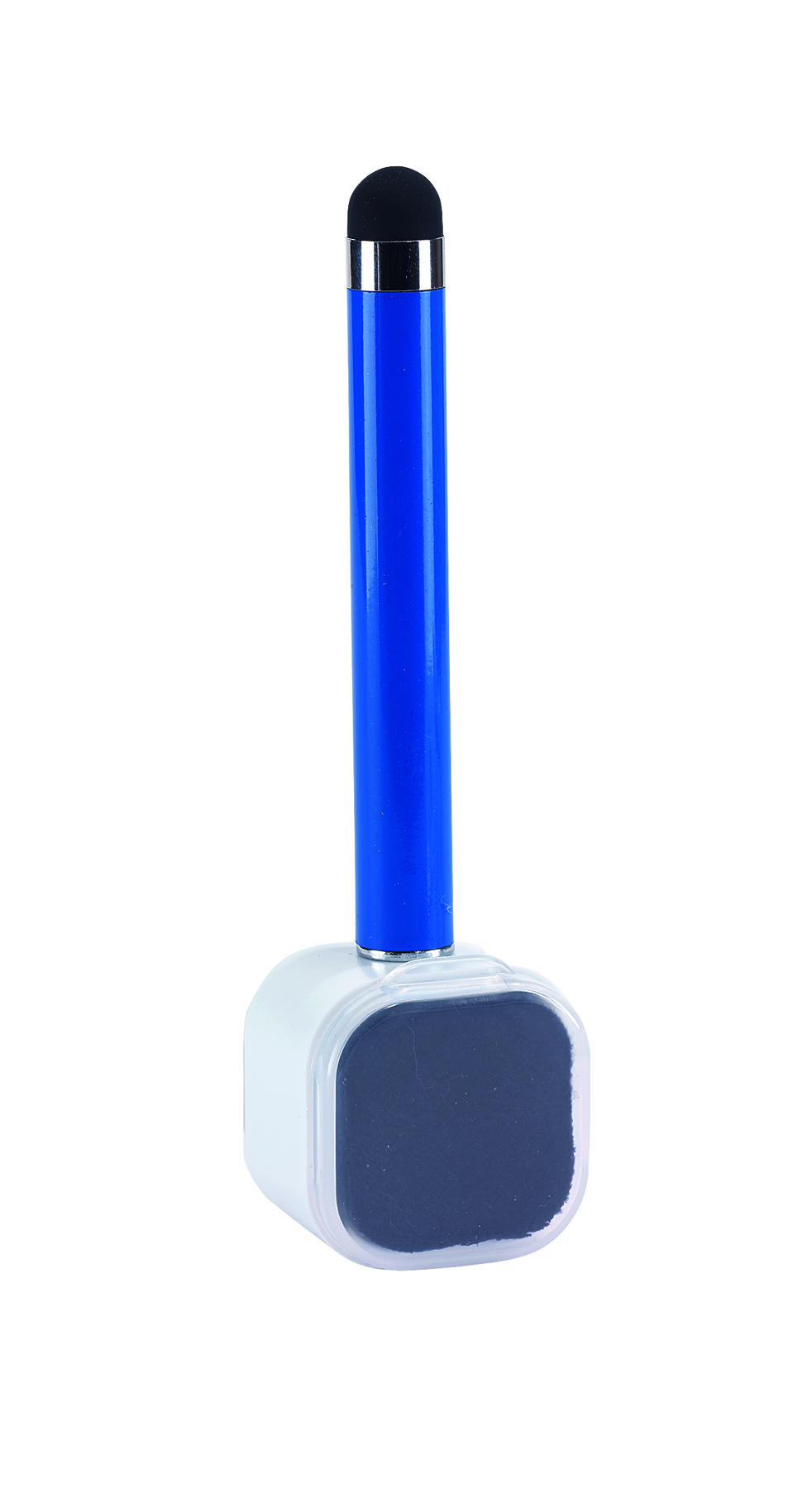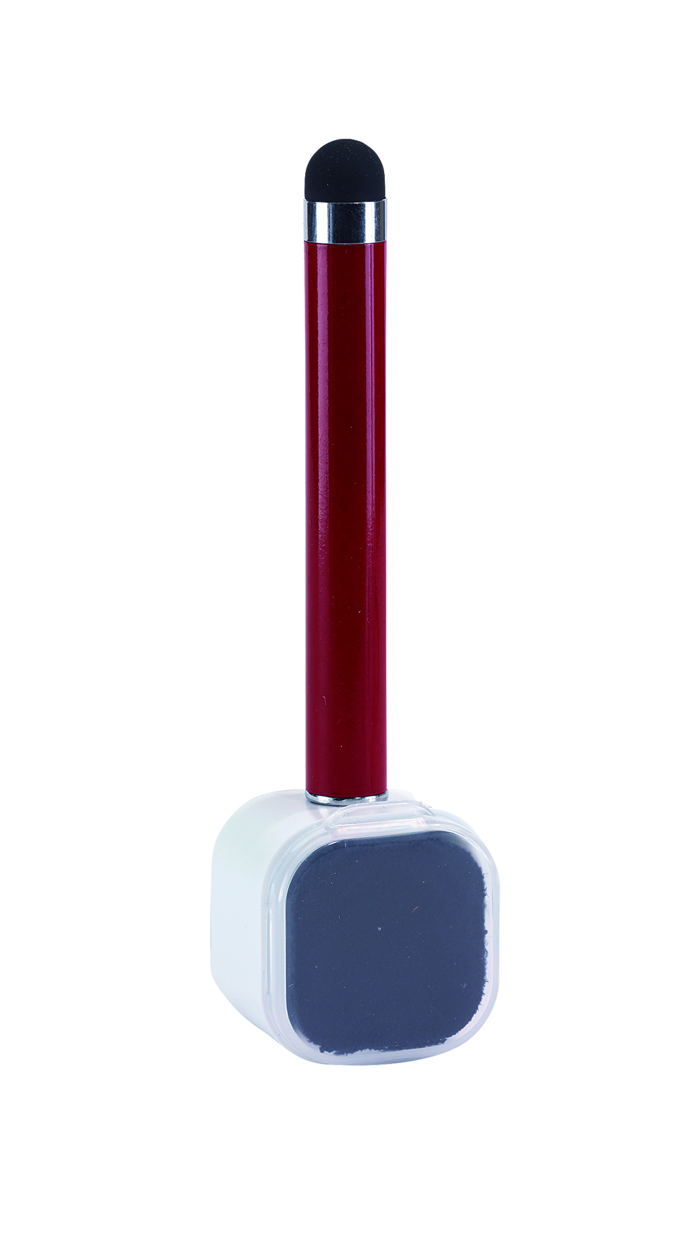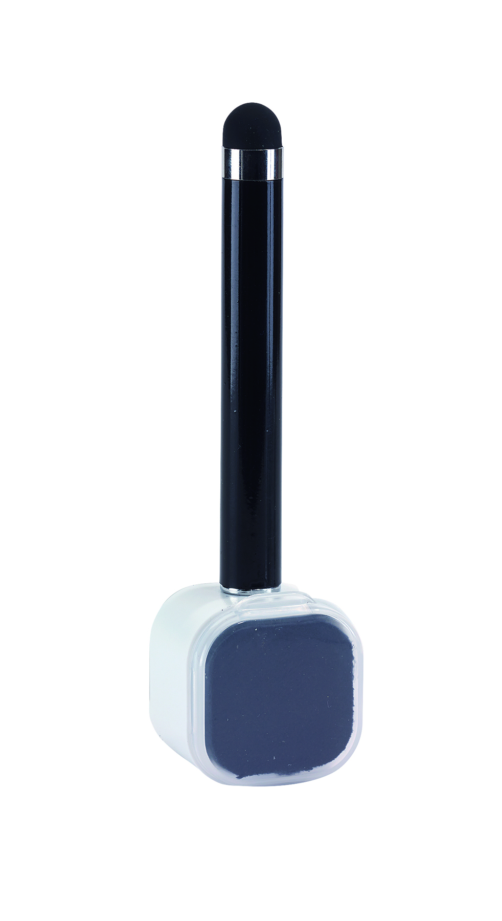 Touch-Kugelschreiber SCREEN CLEAN : eine Seite mit Kugelschreiber (schwarzschreibend), am Schaftende mit Touchscreen-Spitze zur Bedienung von Smartphones und Tablets, Stiftständer mit integriertem Visitenkarten- bzw. Notizzettelhalter und Displayreiniger
