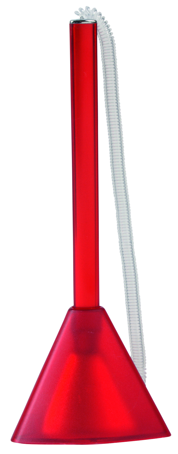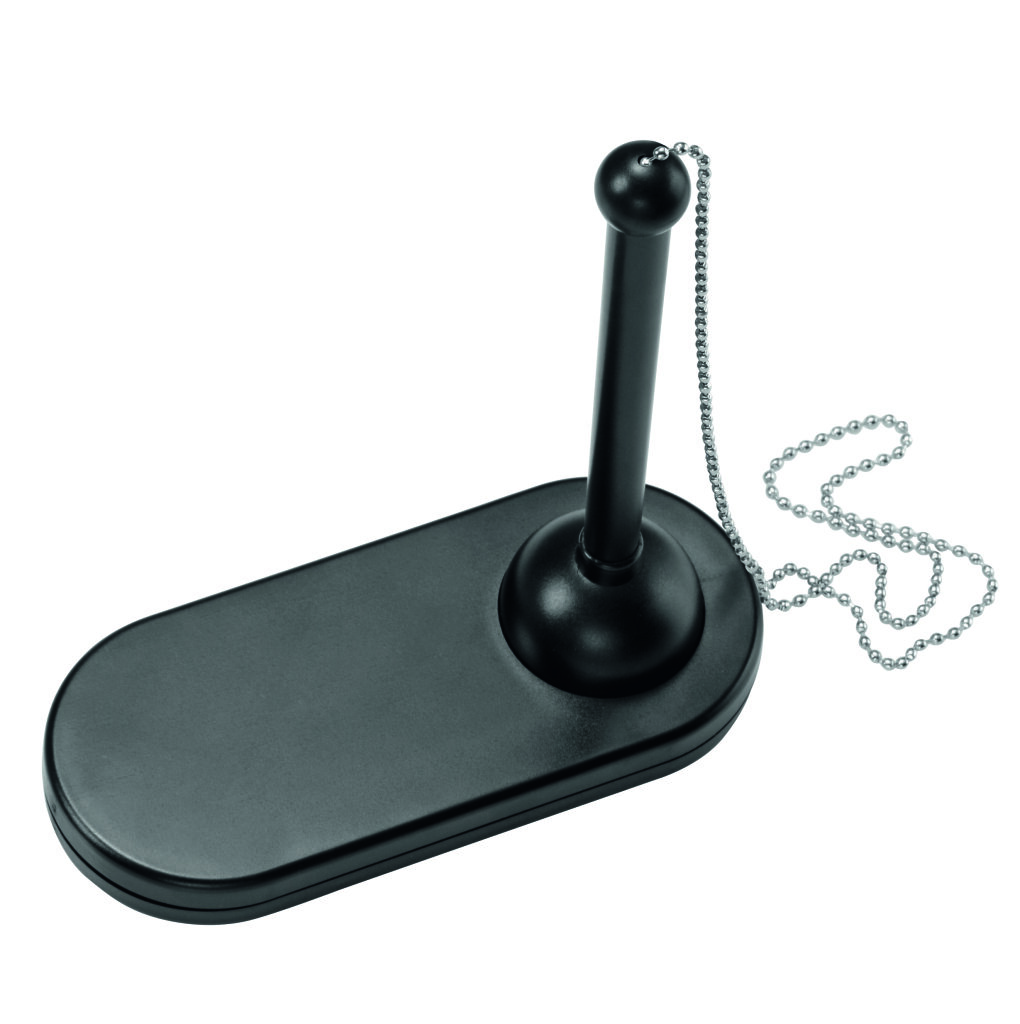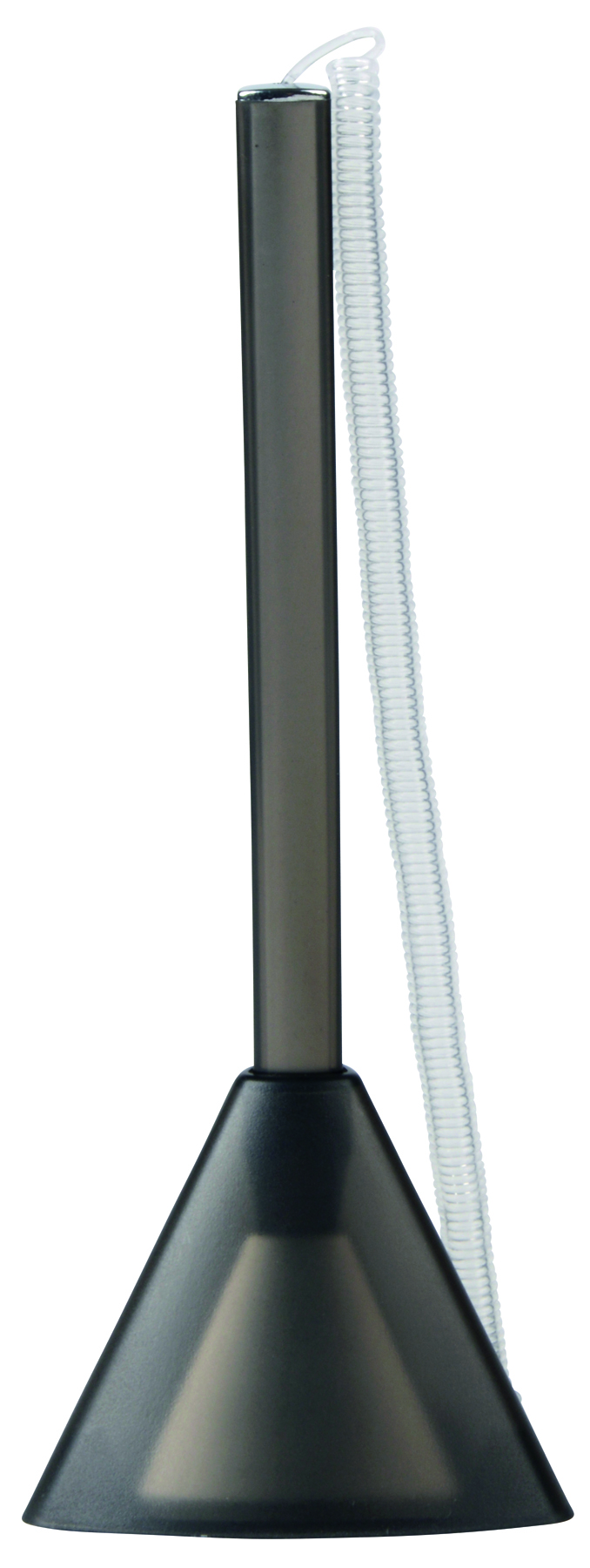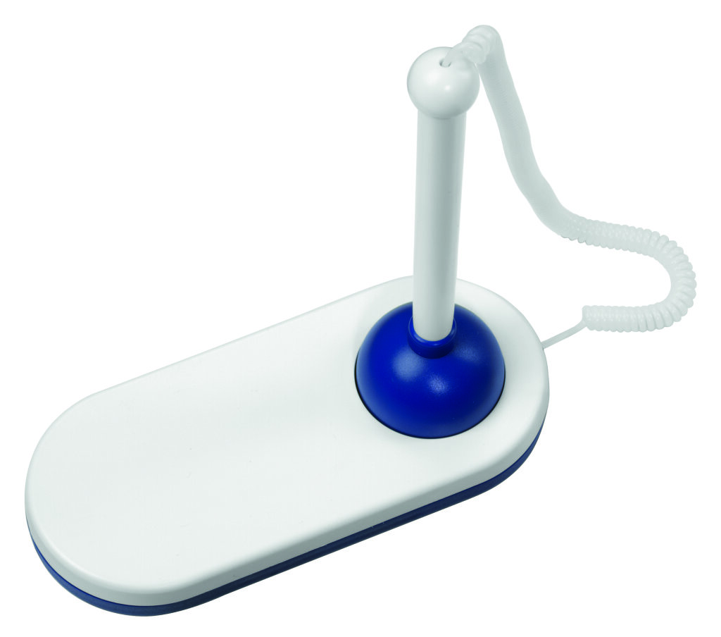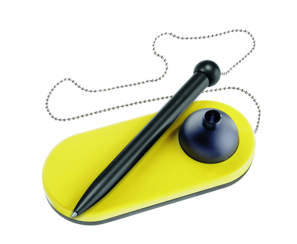 Stifteständer LEGGY auf zwei Füßen: Kugelschreiber (schwarzschreibend) ist an einem elastischen Spiralkabelband befestigt, inkl. Klebepads unter den Füßen für einen sicheren Stand