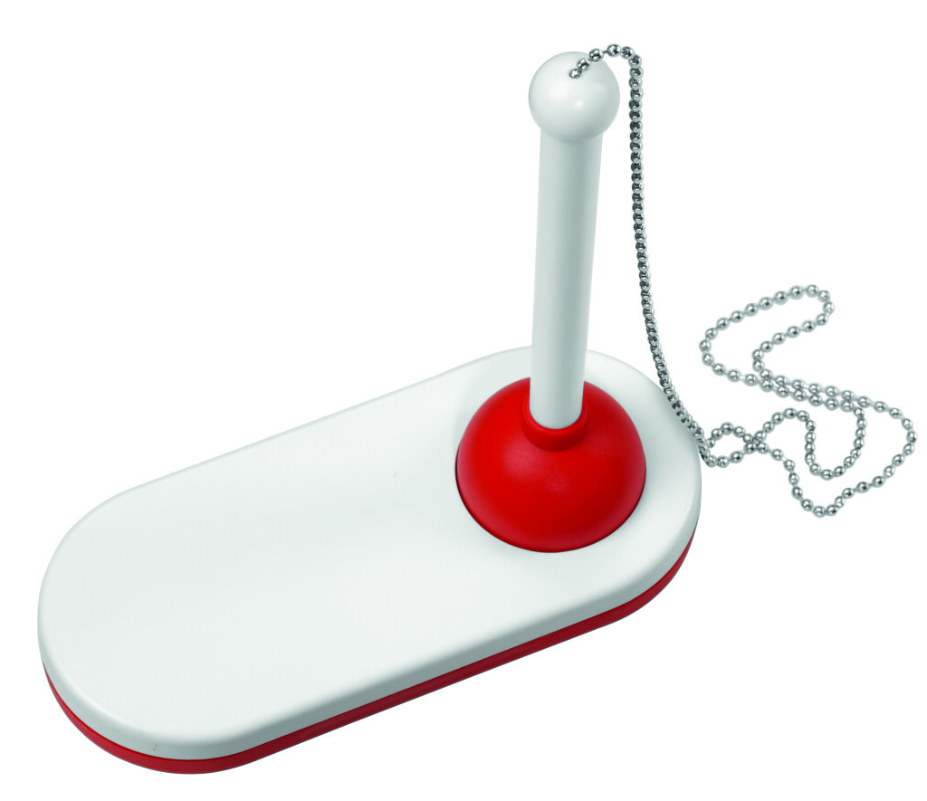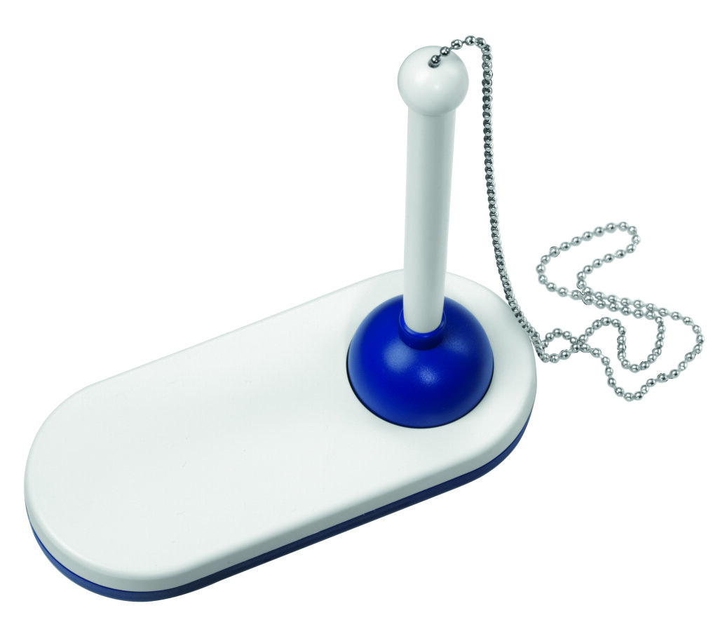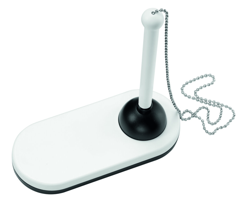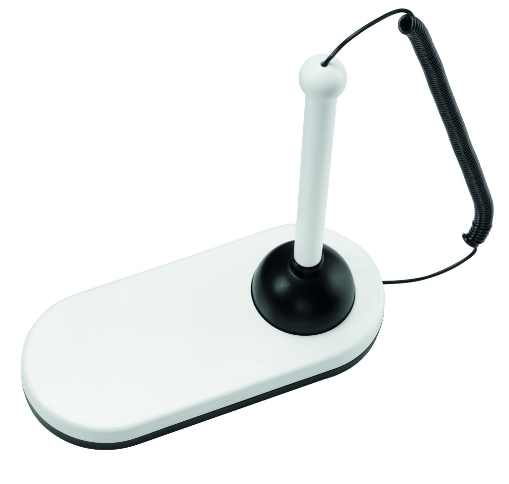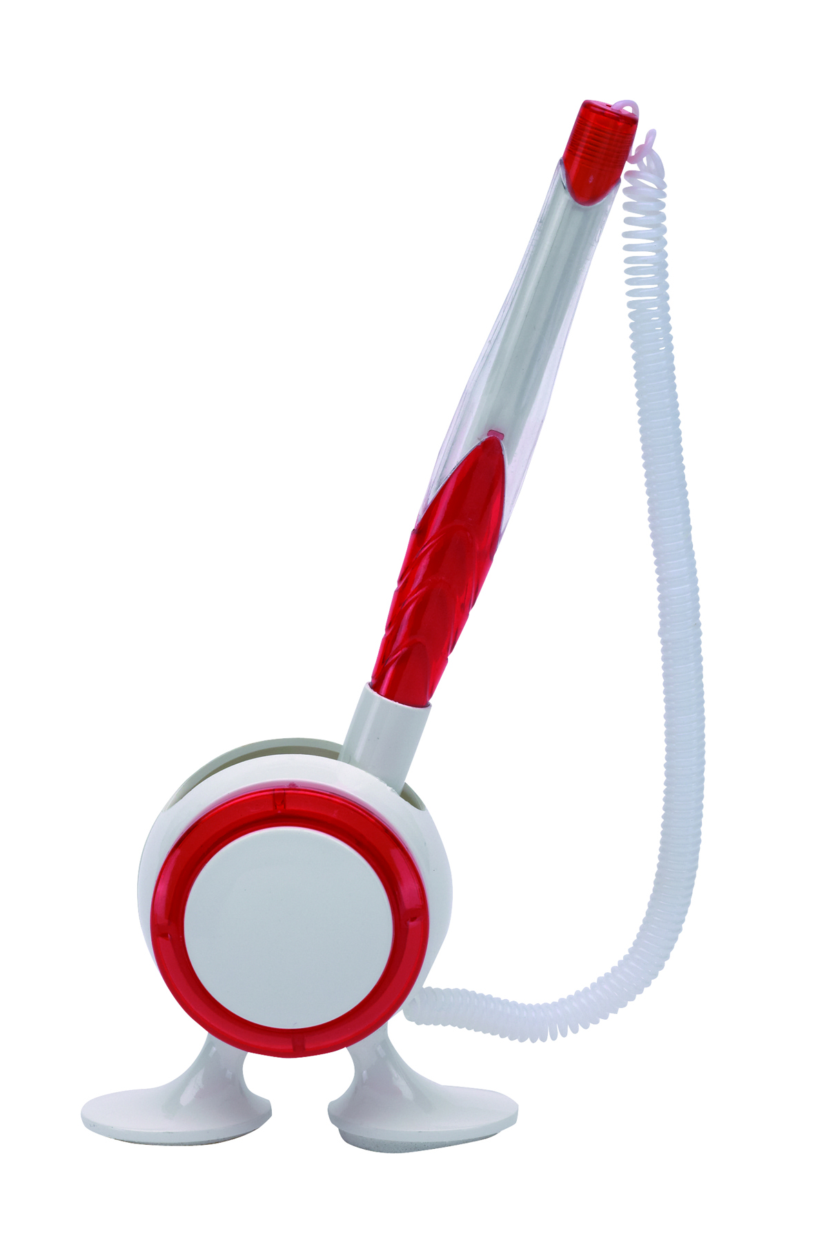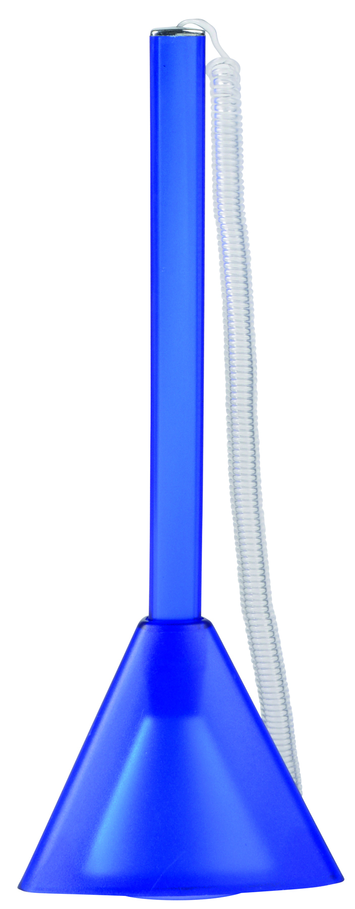 Stifteständer LEGGY auf zwei Füßen: Kugelschreiber (schwarzschreibend) ist an einem elastischen Spiralkabelband befestigt, inkl. Klebepads unter den Füßen für einen sicheren Stand