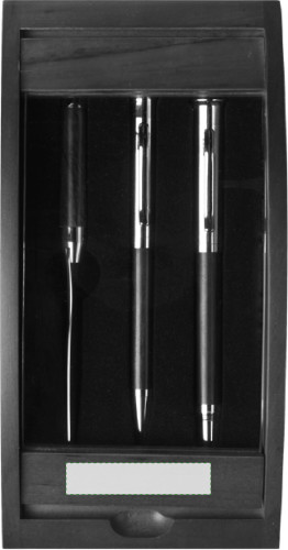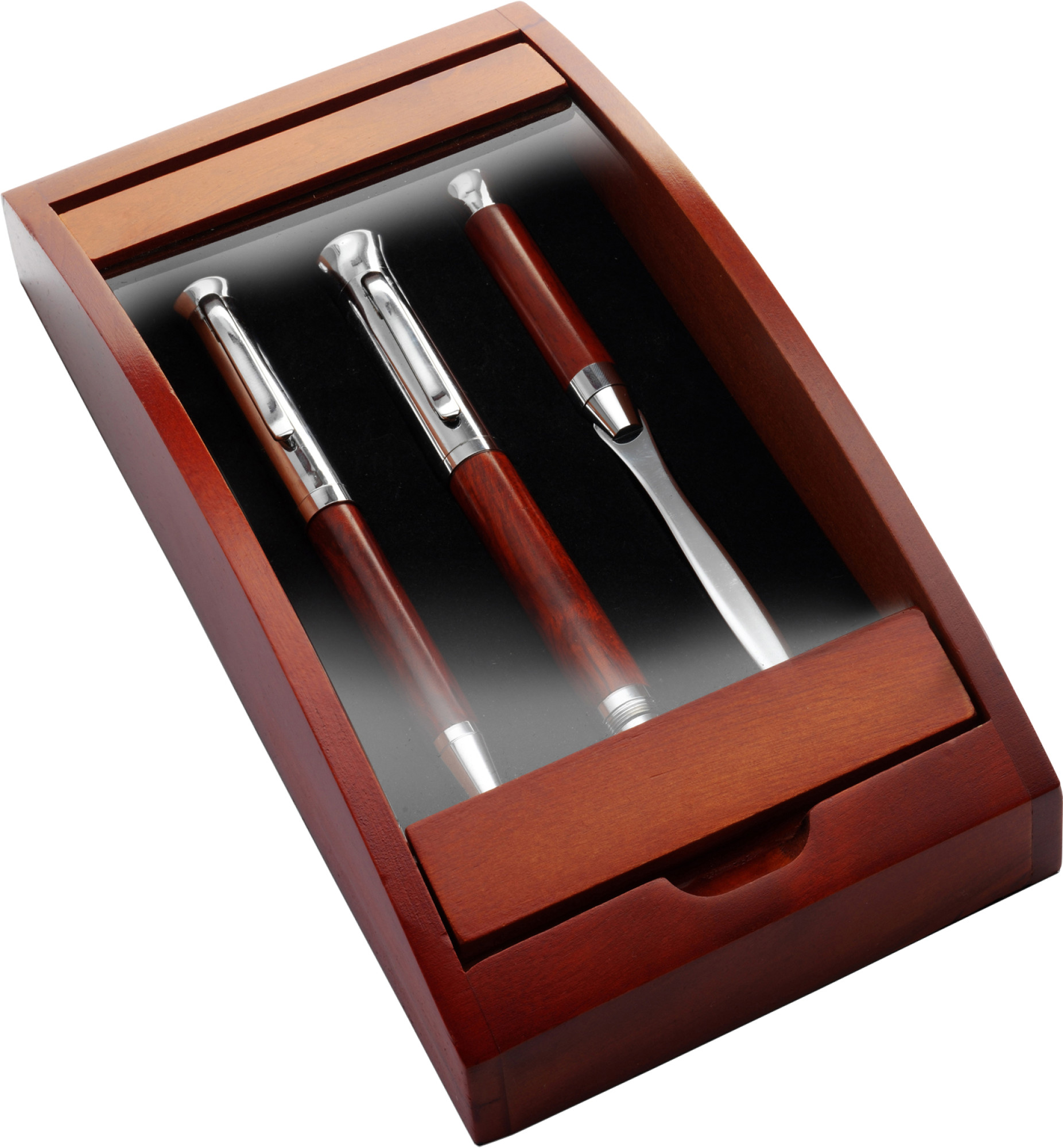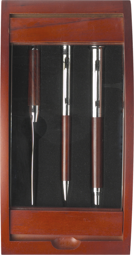 Schreibset aus Rosenholz, bestehend aus Drehkugelschreiber (schwarze Mine), Füllfederhalter, Brieföffner und Holz-Etui mit Echtglas-Scheibe.