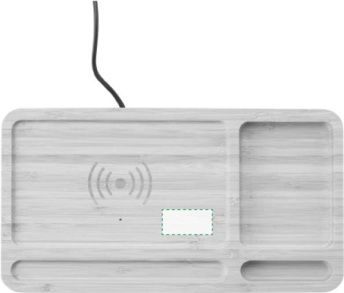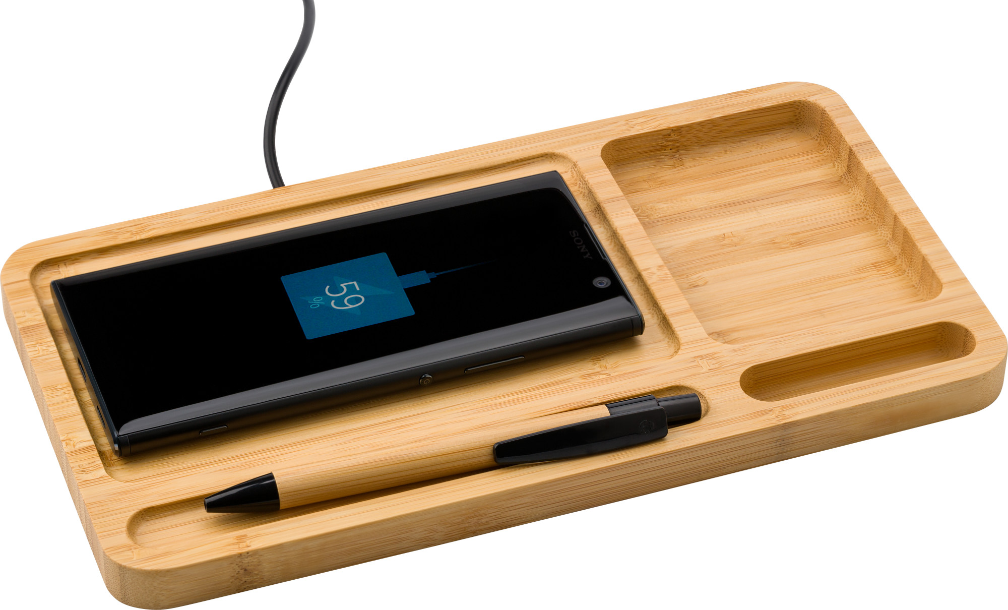 Schreibtisch-Organizer aus Bambus mit kabelloser Ladefunktion (5W). Ausgang 5V?800mA. Inklusive USB-Ladekabel.