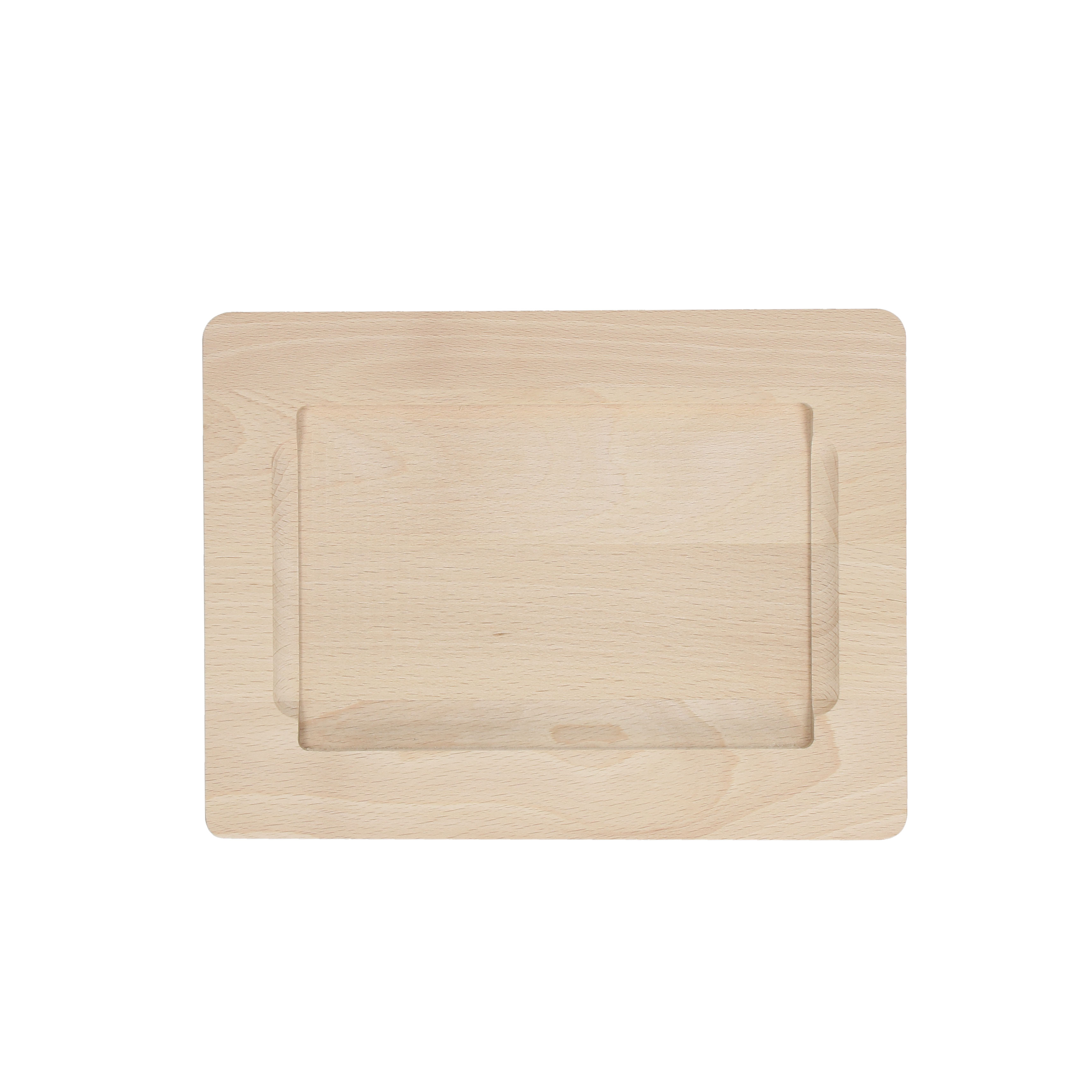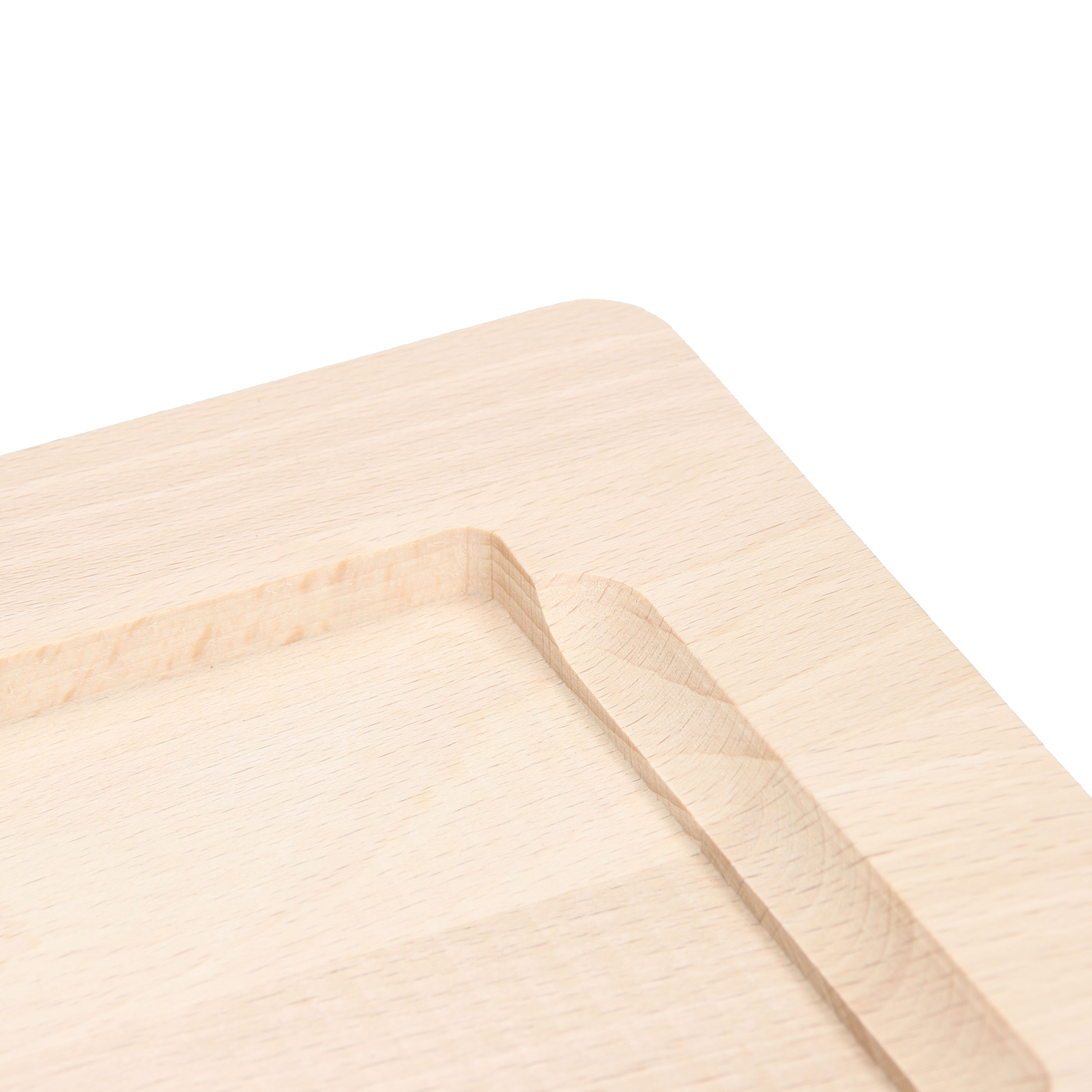Ökologisches, kleines Servierbrett aus Buchenholz mit Vertiefung auf der Oberseite, welche ein Herunterrutschen oder -rollen von zubereiteten Speisen verhindert. Ideal auch in Kombination mit Glas- und Schiefer-Einlegeplatten (Art.Nr. 09452 und 09461). Mit Anti-Rutsch-Noppen an der Unterseite. Reinigung ausschließlich per Hand.