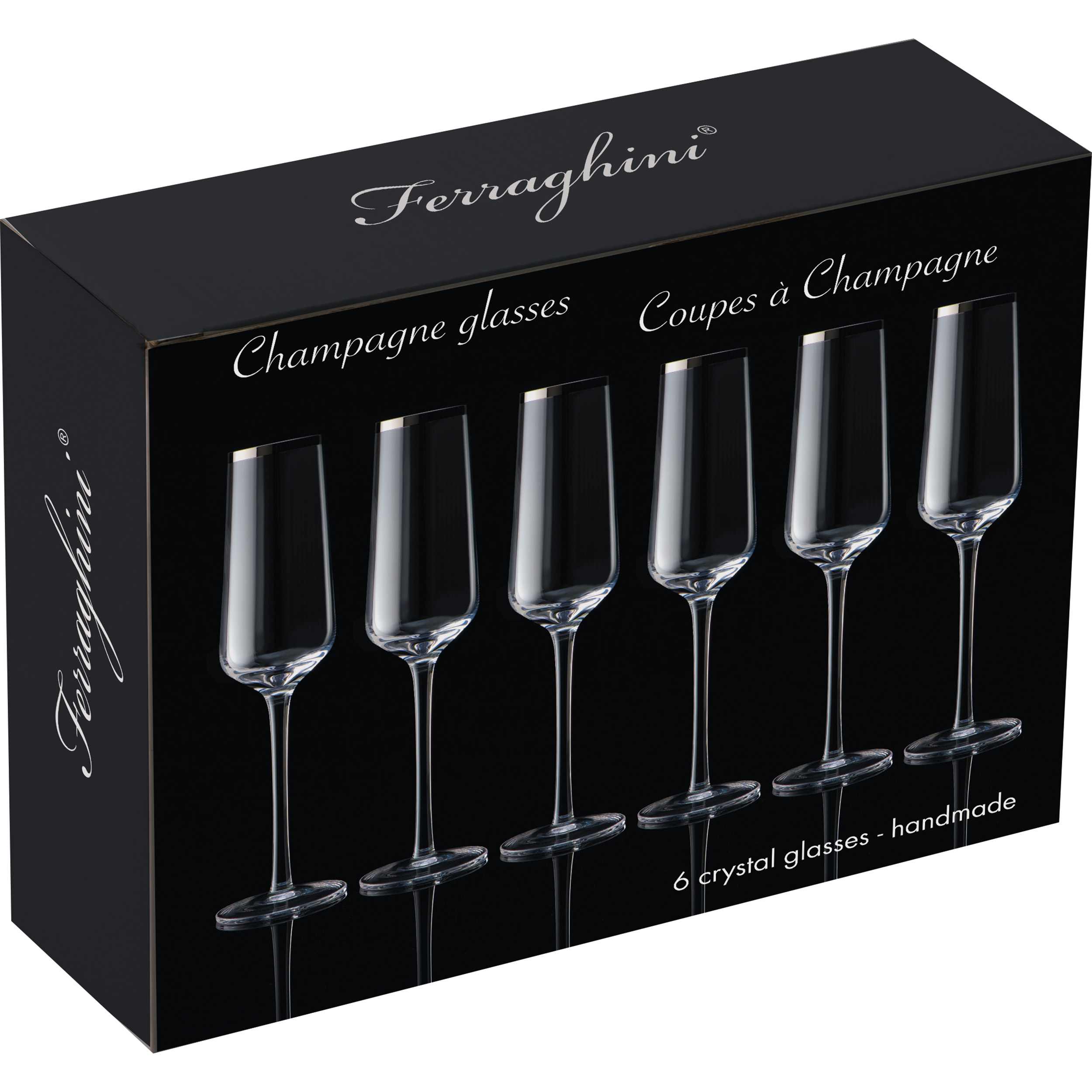 Set bestehend aus 6 Kristall-Champagnergläsern, mundgeblasen. Ihre Werbung wird mittels Etikett auf dem Einzelkarton angebracht.