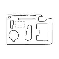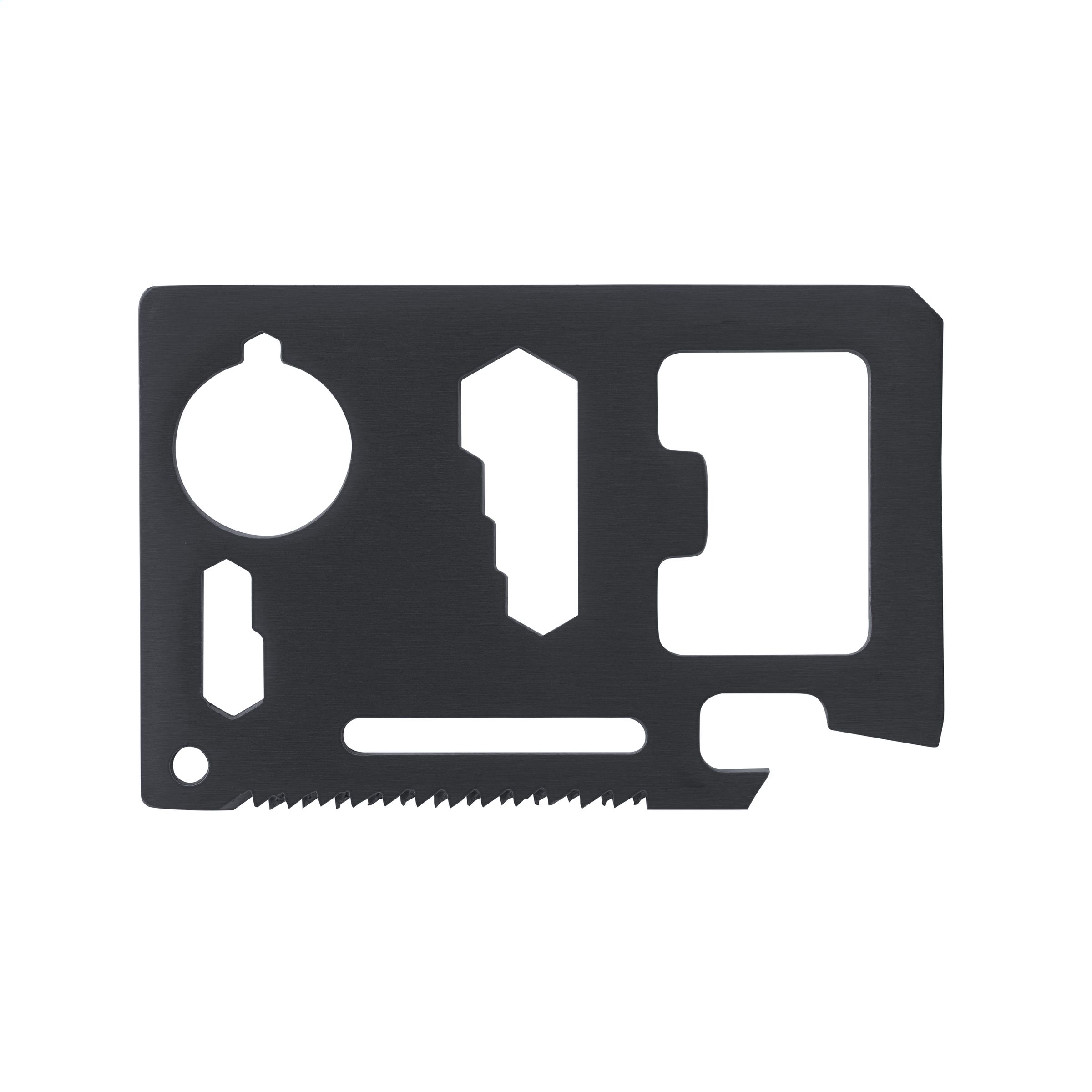 Multitool aus Edelstahl in Kreditkartenformat mit 11 Funktionen: Dosenöffner, Schraubenzieher, Lineal, Kapselheber, Schraubenschlüssel, Flügelzange, Säge, Winkelmesser, 2-seitiger Schraubenschlüssel und Schlüsselanhänger. In einem Etui aus Imitatleder. Inklusive Gebrauchsanweisung.