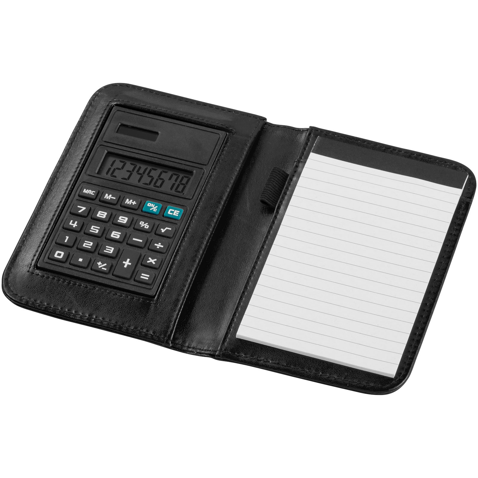 Notizbuch mit 8 stelligem Rechner und A6 Notizbuch mit 20 Blatt (70 g/m²) liniert und Stiftschlaufe. Batterie mitgeliefert und eingelegt.