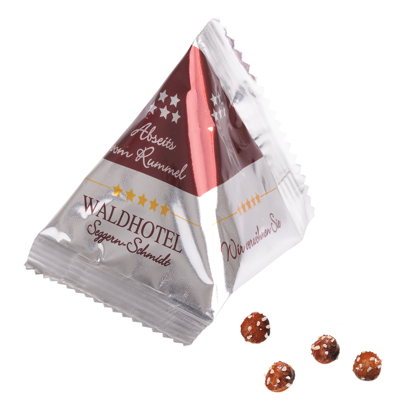 Produkt: Tetraeder aus silberner Aromaschutzfolie (beim Snack Tetraeder ist keine transparente Folie möglich), individuell bedruckt br>Inhalt: Roland Pretzel-Balls, salziges Knabbergebäck, ca. 8 g br>Haltbarkeit: 10 Monate br>Preise: € / Tetraeder inkl. 2-c Flexodruck zzgl. Drucknebenkosten.
