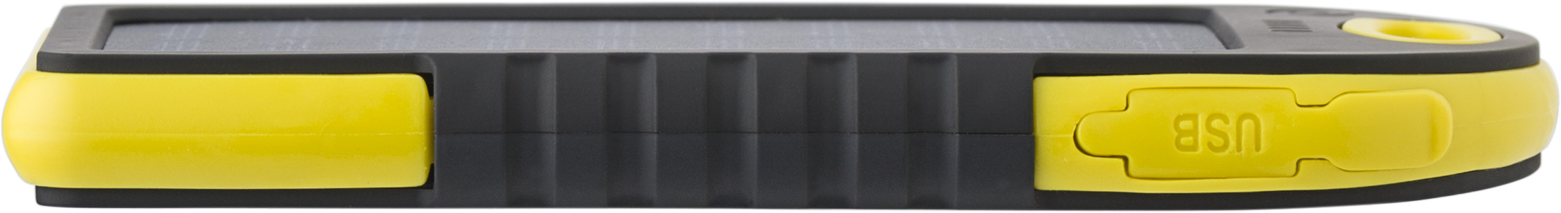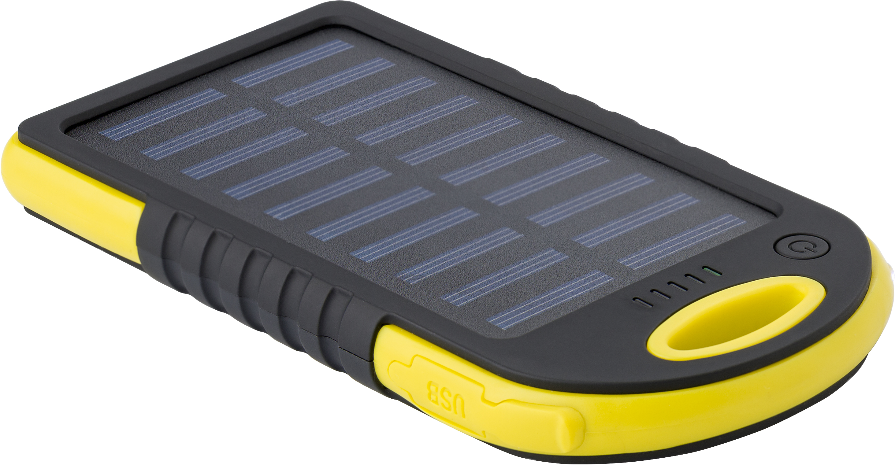 Solar Powerbank-Ladegerät mit grünen Anzeigeleuchten und Taschenlampe an der Seite. Zwei USB-Anschlüsse und ein Mikro-USB-Anschluss. Solaraufladung 5V/200mA. Eingang DC 5V/1A. Ausgang DC 5V/2x1A. Kapazität: 4.000 mAh. Inkl. USB-Kabel.