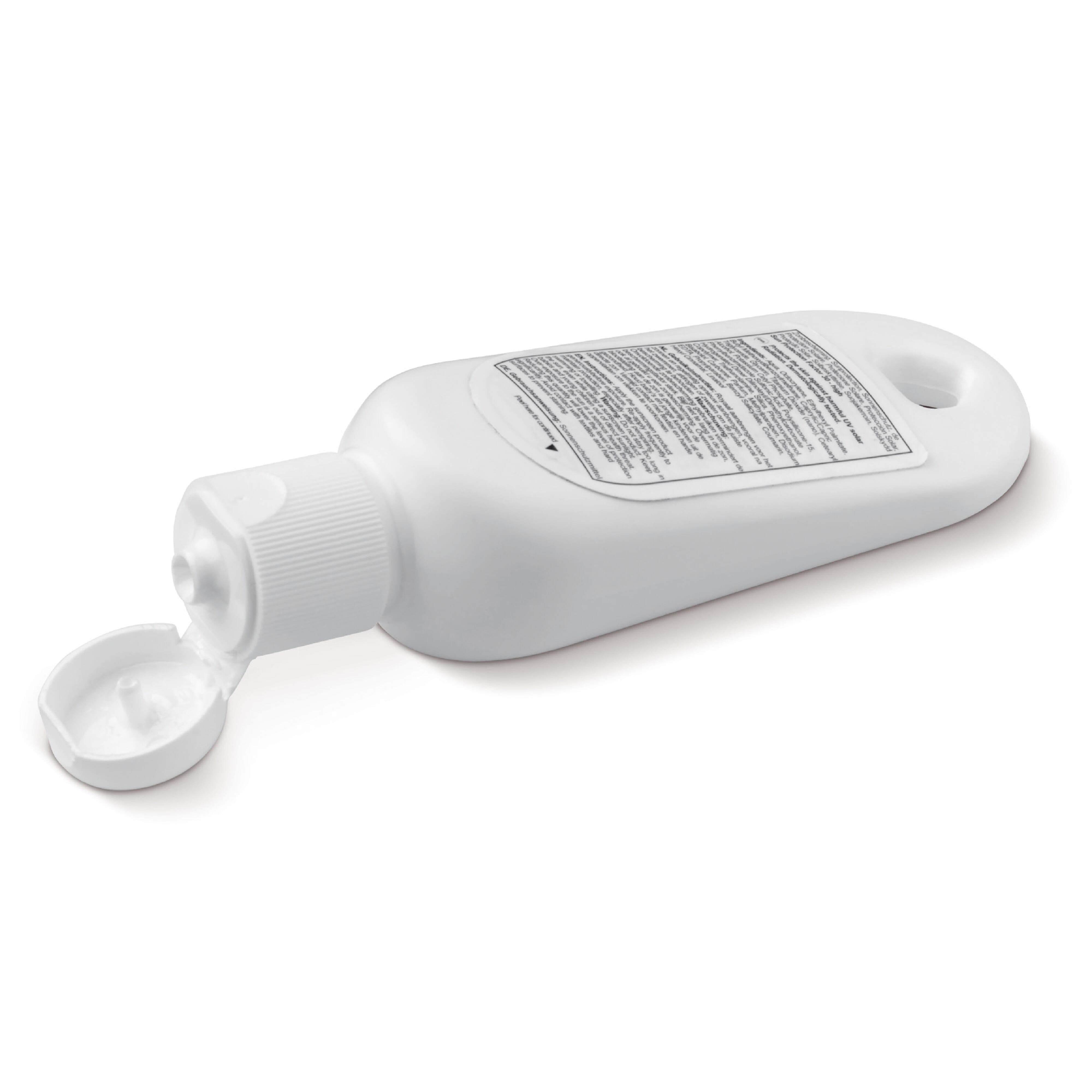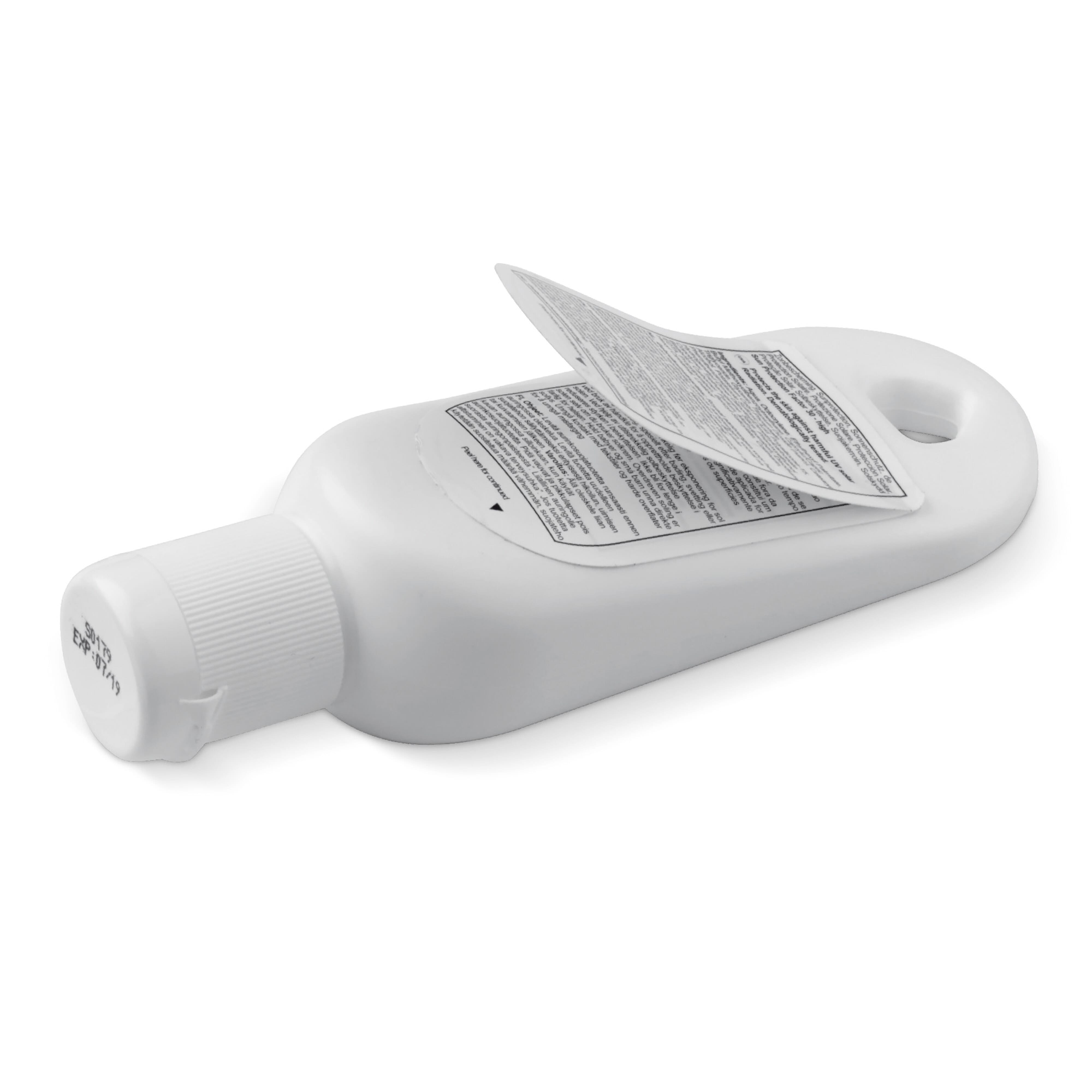 Diese kompakte Sonnencreme, ist perfekt für einen Tag am Strand oder auf einem Festival. Dank der runden Öffnung, können Sie die Flasche einfach an einem Schlüsselbund oder eine Tasche befestigen. Der Aufkleber kann vollfarbig bedruckt werden.