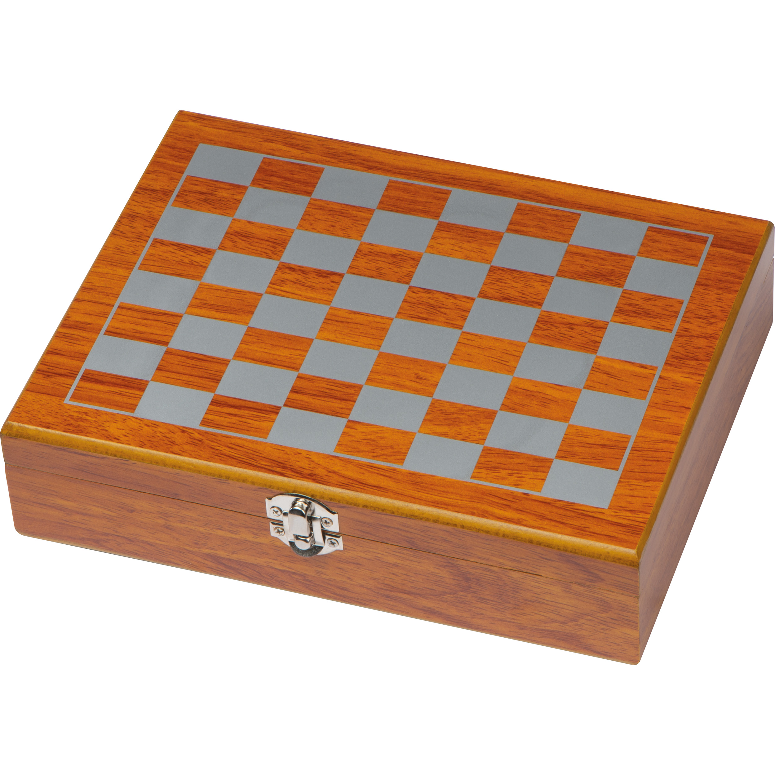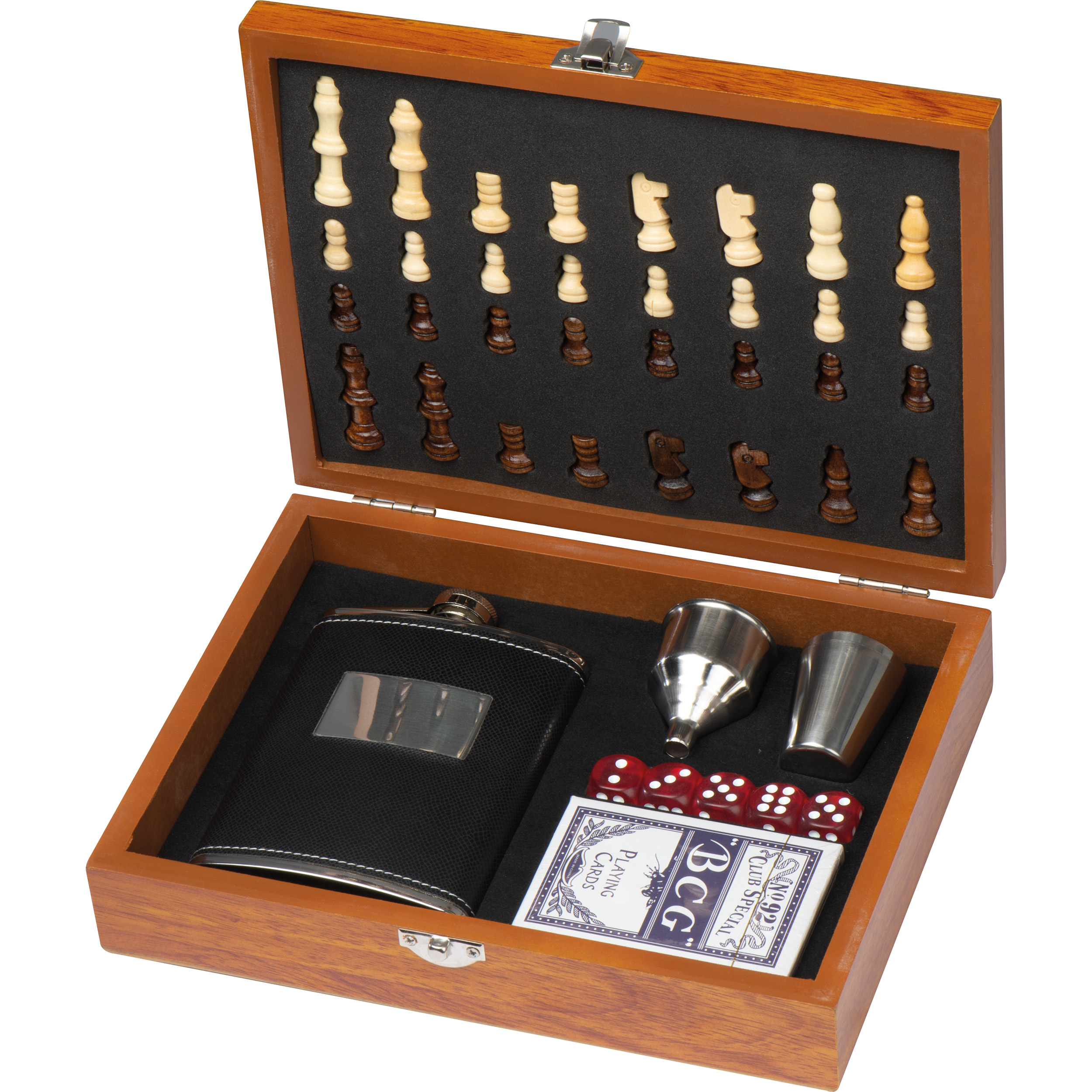 Spieleset mit Flachmann (Füllvermögen 237ml), 2 Schnapspinchen, einem Trichter, 5 Würfeln, einem Schach- und einem Kartenspiel in einer Holzbox. Ihre Werbung lasern wir auf den Flachmann.
