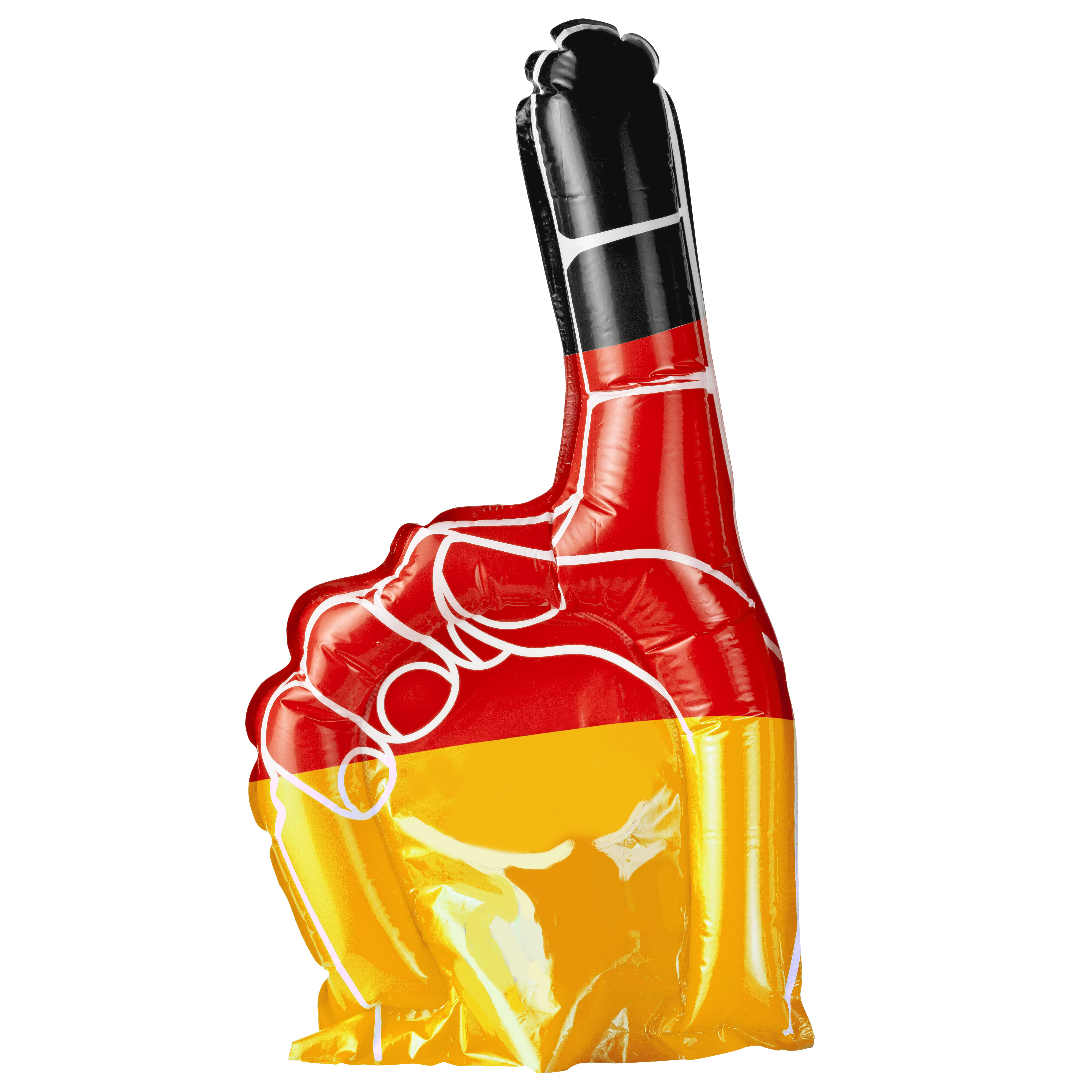 Zeigefinger in schwarz-rot-gelb. Das Fan-Accessoire ist komplett aus PE-