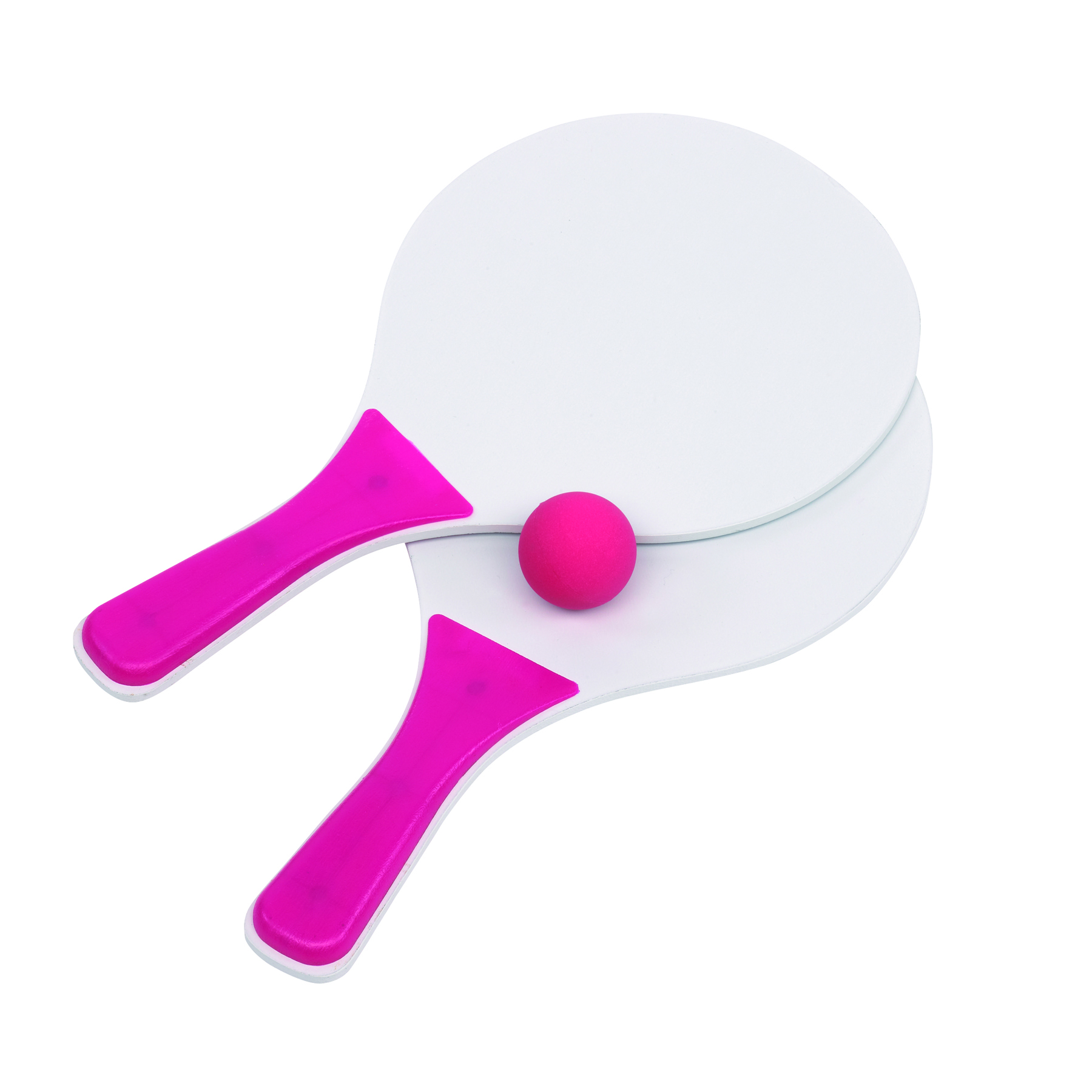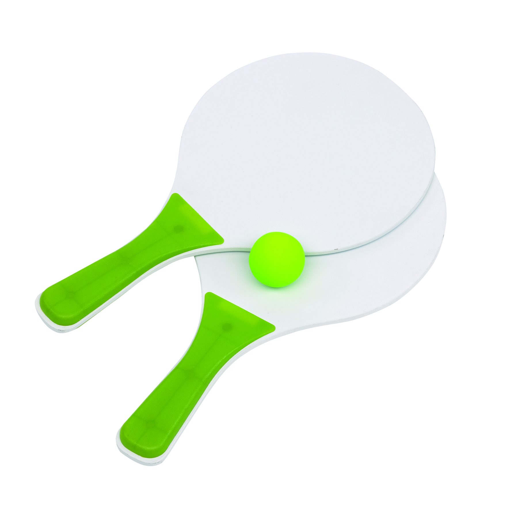 Dieses Sportset aus Pappelholz sorgt für viel Spaß und Bewegung zu zweit am Strand, im Park oder im Garten. Die Schläger haben eine Größe von 40 x 20 x 0,7 cm und sind in schwarzer Farbe lackiert, was eine große Fläche für den Druck eines Logos bietet. Die Griffe sind mit PU-Band umwickelt und bieten maximalen Halt, wenn es beim Spiel lebhaft zugeht. Das Set ist komplett mit 2 Bällen aus PP-Material in einem Netzbeutel aus Polyester mit einer Größe von 45 x 26 cm verpackt. Achtung! Nicht für Kinder unter drei Jahren geeignet. Verschluckbare Kleinteile, Erstickungsgefahr.