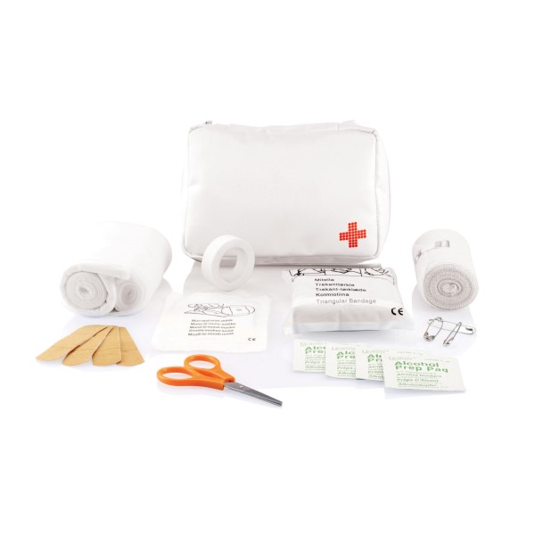 24-tlg., inklusive Verbandsmaterial, medizinischen Handschuhen, Schere und medizinischen Pflastern, gesamter Inhalt passt in einen Briefumschlag, Gewicht nur 200g, zusammen konfektioniert im farbigen Nylontäschchen, EN 13485:2003 konform.