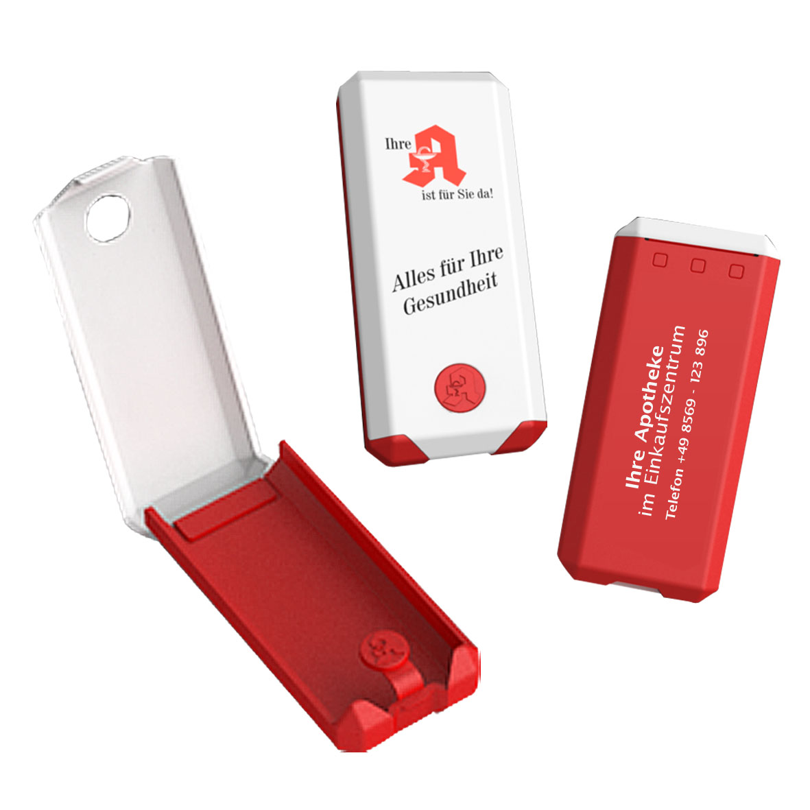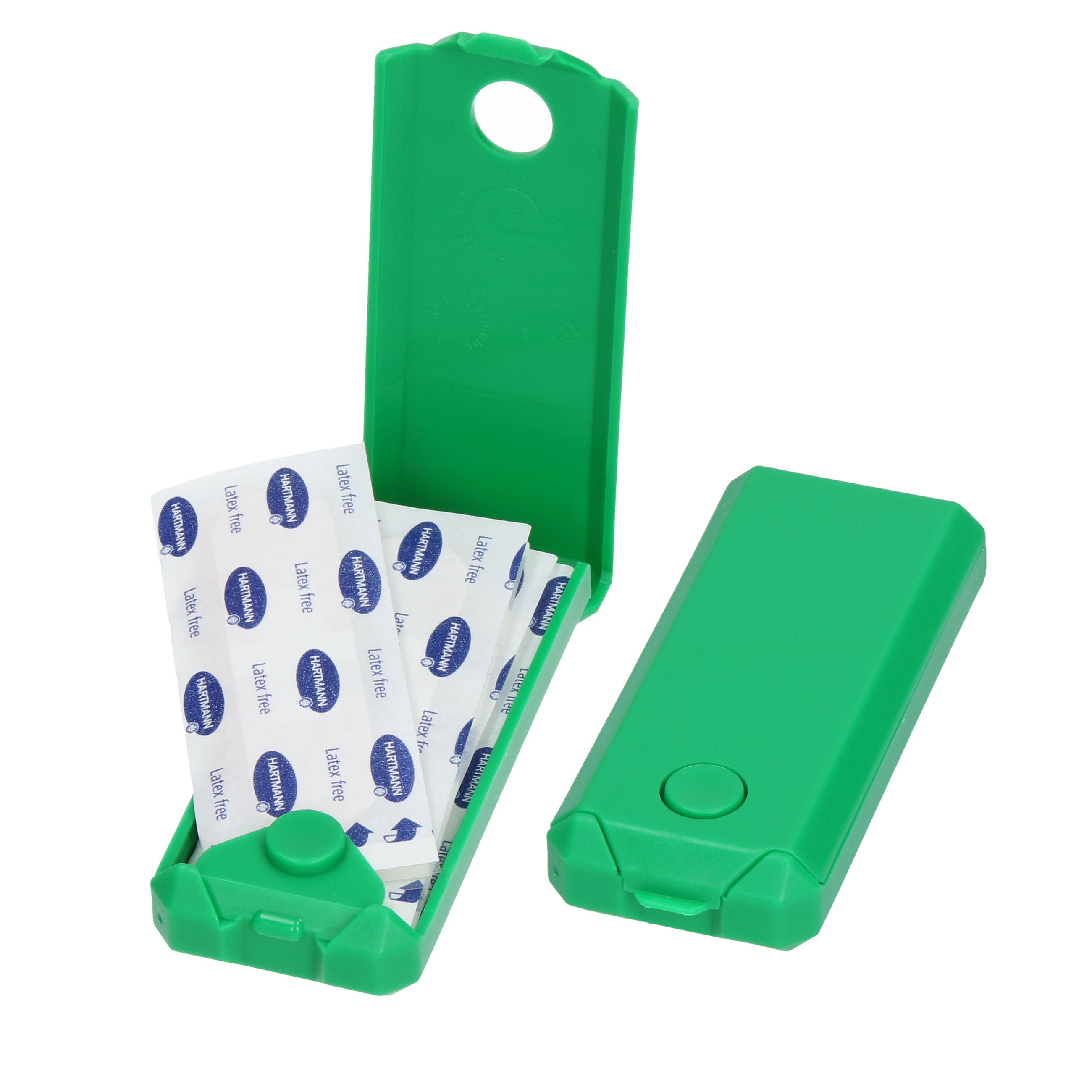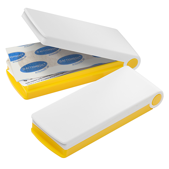 Mit einer Hand zu öffnen aufgrund des Druckknopf-Klickverschlusses. Kunststoffbox befüllt mit 5 x 2-er Pflastern. Farbkombinationen, Fußball-Design und geprägtes Logo im Verschlussknopf auf Anfrage.