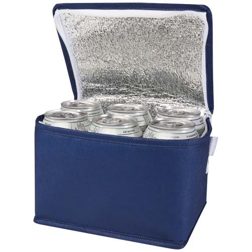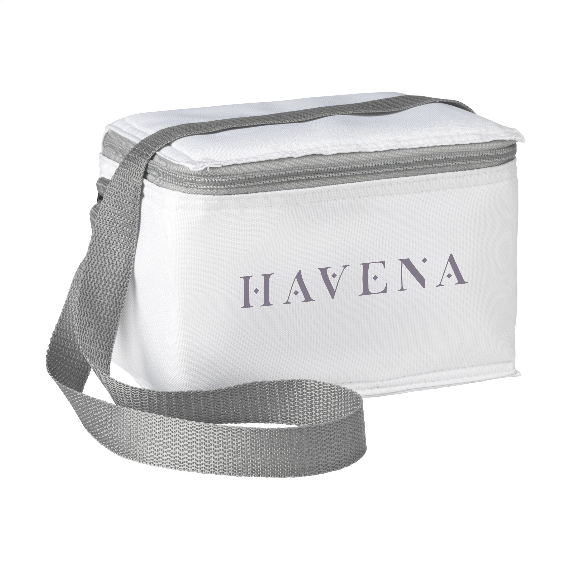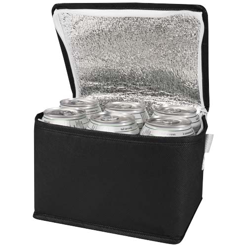 Kühltasche aus Polyester (600D) und rPET mit PEVA-Innenausstattung, für sechs 330-ml-Dosen. Mit Reißverschluss, Fronttasche und verstellbarem Gurt. Fassungsvermögen: 3 Liter.