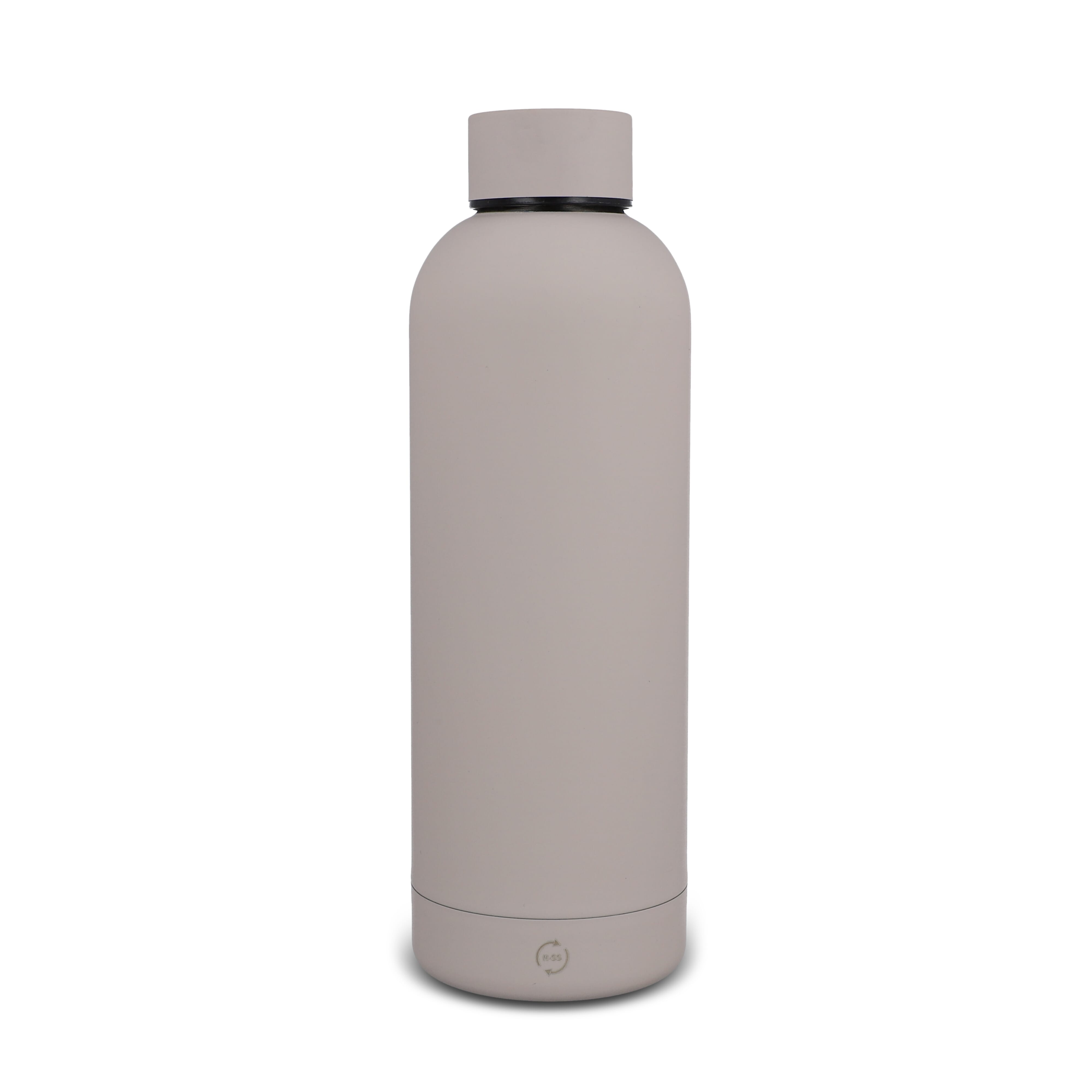Doppelwandige Isolierflasche aus recyceltem Edelstahl. 90% recycelter Edelstahl und 10% Edelstahl. Füllmenge: 500 ml. Auslaufsicher. Nicht für kohlensäurehaltige Getränke geeignet.