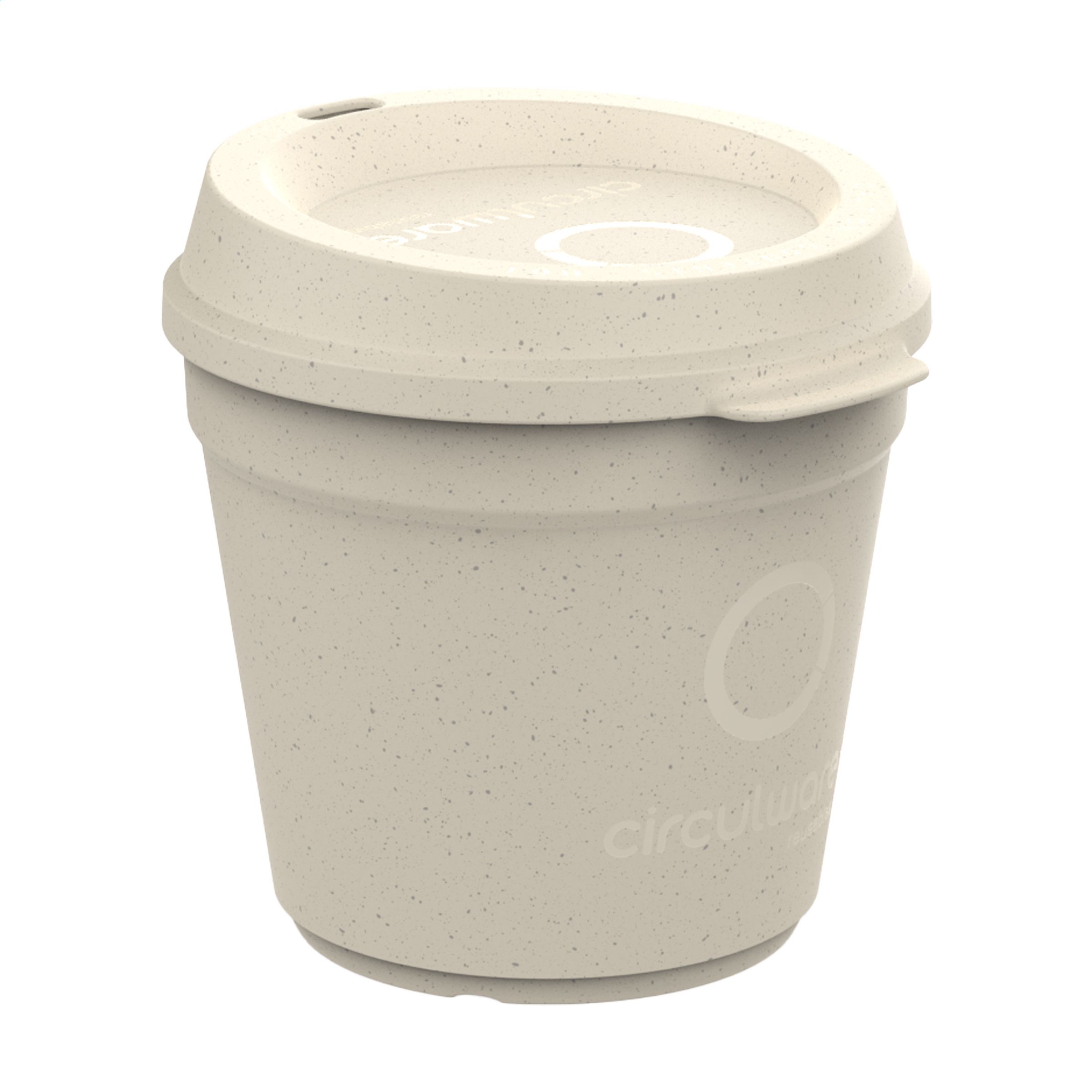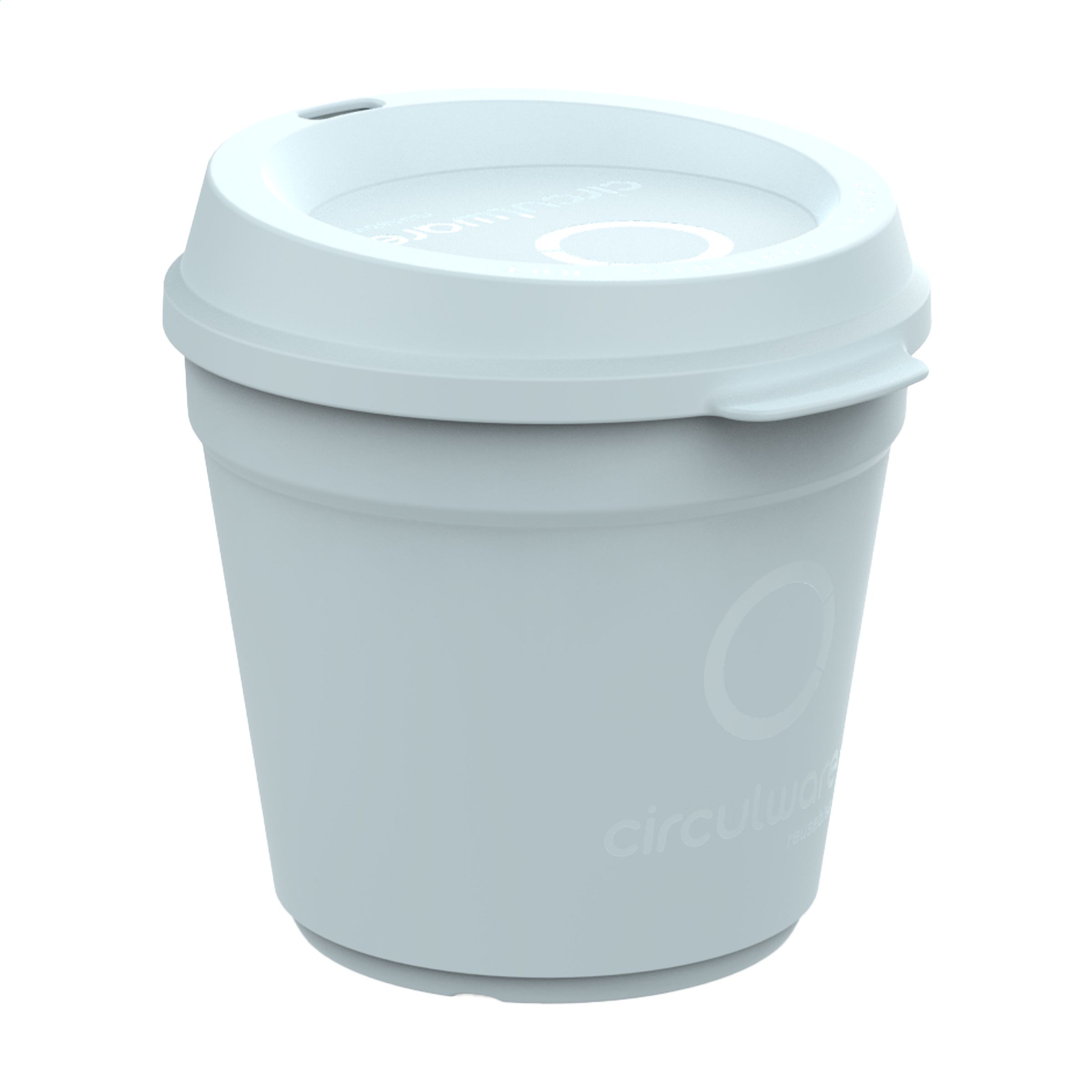 Wiederverwendbarer, stapelbarer Becher mit Deckel der Marke Circulware. Dieser Becher ist aus hochwertigem Kunststoff hergestellt und kann bis zu 500 Mal verwendet werden. Der stapelbare Deckel besteht zu 100% aus recycelbarem Kunststoff und schließt perfekt. Dies macht ihn zu einem idealen Becher für unterwegs. Geeignet für einen heißen Kaffee oder ein erfrischendes Getränk. Eine großartige Alternative zum Einwegbecher. Der Becher ist leicht, einfach zu reinigen und stapelbar, also platzsparend. BPA-frei und für Lebensmittel zugelassen. Spülmaschinengeeignet und mikrowellengeeignet. 100% recycelbar. Damit leistet dieser Becher einen Beitrag zur Kreislaufwirtschaft. Niederländisches Design. Made in Holland. Fassungsvermögen: 200 ml.