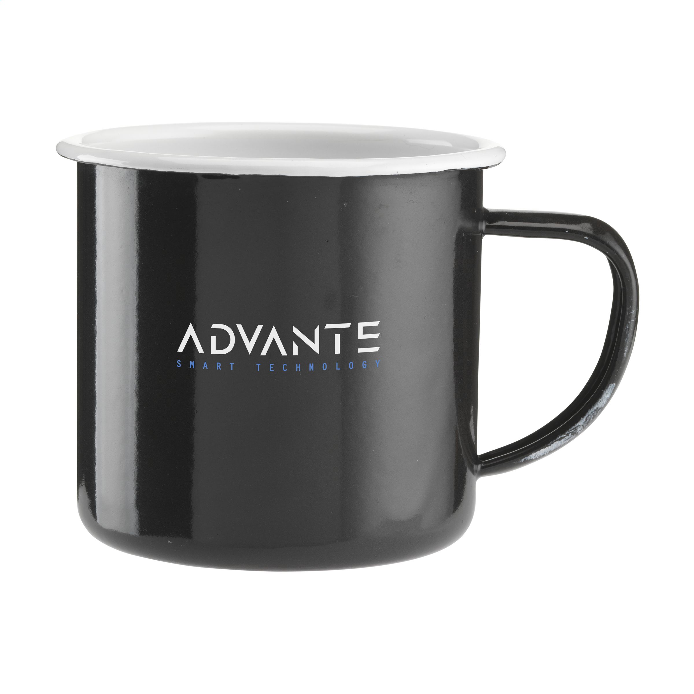 Emaillierte Tasse. Ein Design im beliebten Retro-Stil. Um die Retrooptik zu betonen, hat die Tasse Unvollkommenheiten. Fassungsvermögen 350 ml. Wird einzeln in einem Kraftkarton geliefert.
