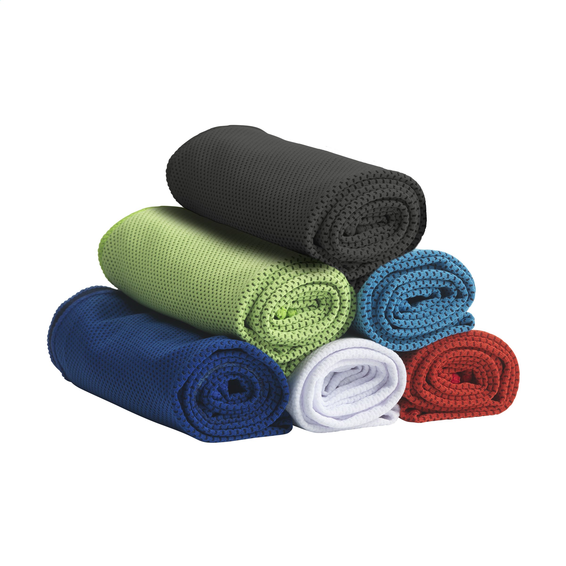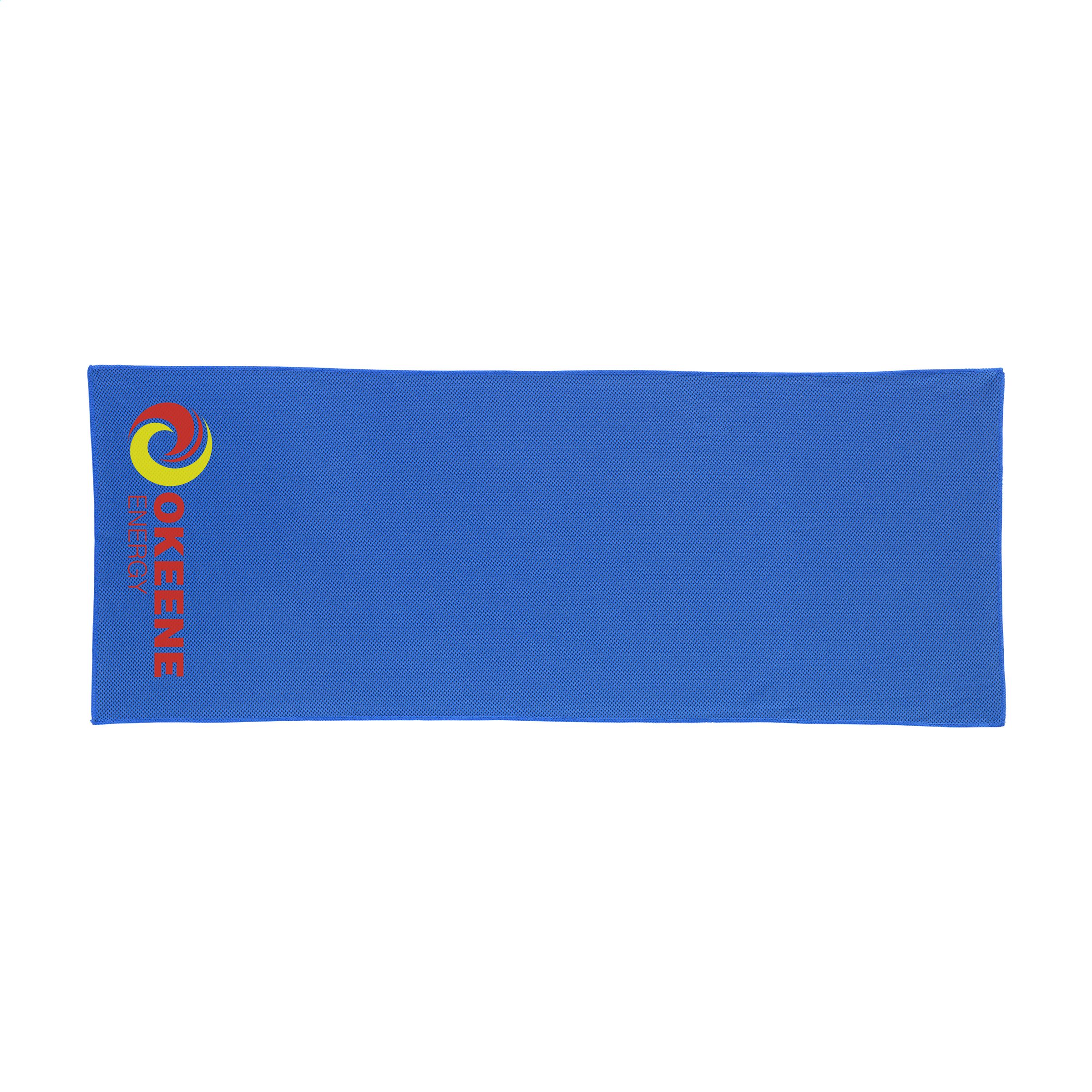 Spezielles Kühlhandtuch aus 100 % Polyester. Nach dem Eintauchen in kaltes Wasser kann dieses Handtuch bei sportlichen Aktivitäten oder Sonnenbrand kühlen. Ideales Format, um es zur Kühlung im Nacken zu tragen. Die Vorderseite des Handtuchs ist in Netzstruktur, die Rückseite ist glatt und hat einen dunkleren Farbton als die Vorderseite.