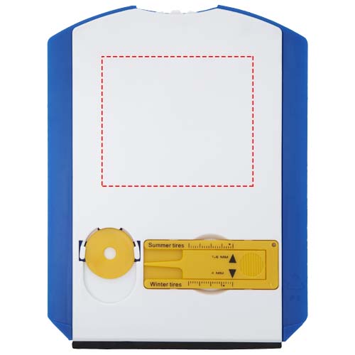 Parkscheibe mit Eiskratzer, Gummiwischer, Einkaufswagen Chip und Reifenprofilmesser. Großer weißer Logobereich auf der Rückseite. „Ankunftszeit“ auf der Vorderseite in den Sprachen Niederländisch, Englisch, Französisch, Deutsch und Italienisch. Vorschriften können sich je nach Ort unterscheiden.