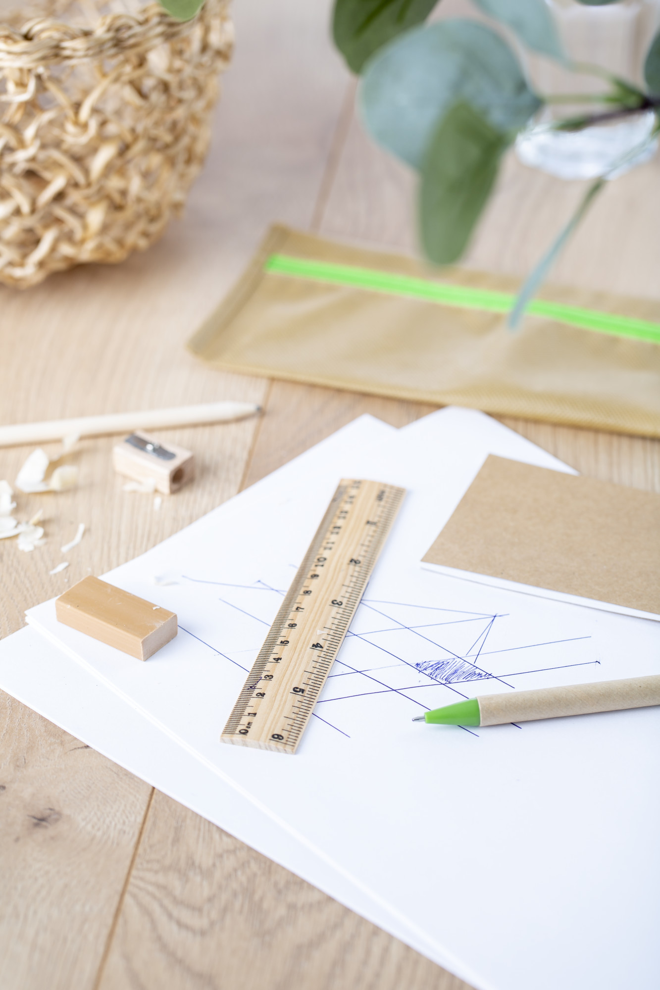 Stifte-Etui aus Non-Woven, mit RV-Hauptfach und Metall-Zipper, Etui mit Notizbuch (20 Blätter), Lineal 0-15 cm, Anspitzer, Radiergummi, Bleistift (unangespitzt) und Kugelschreiber mit blauer Mine.