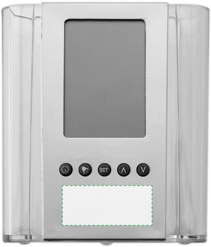 Stifteköcher aus transparentem Kunststoff, mit Uhrzeitanzeige, Kalenderfunktion und Temperaturanzeige.