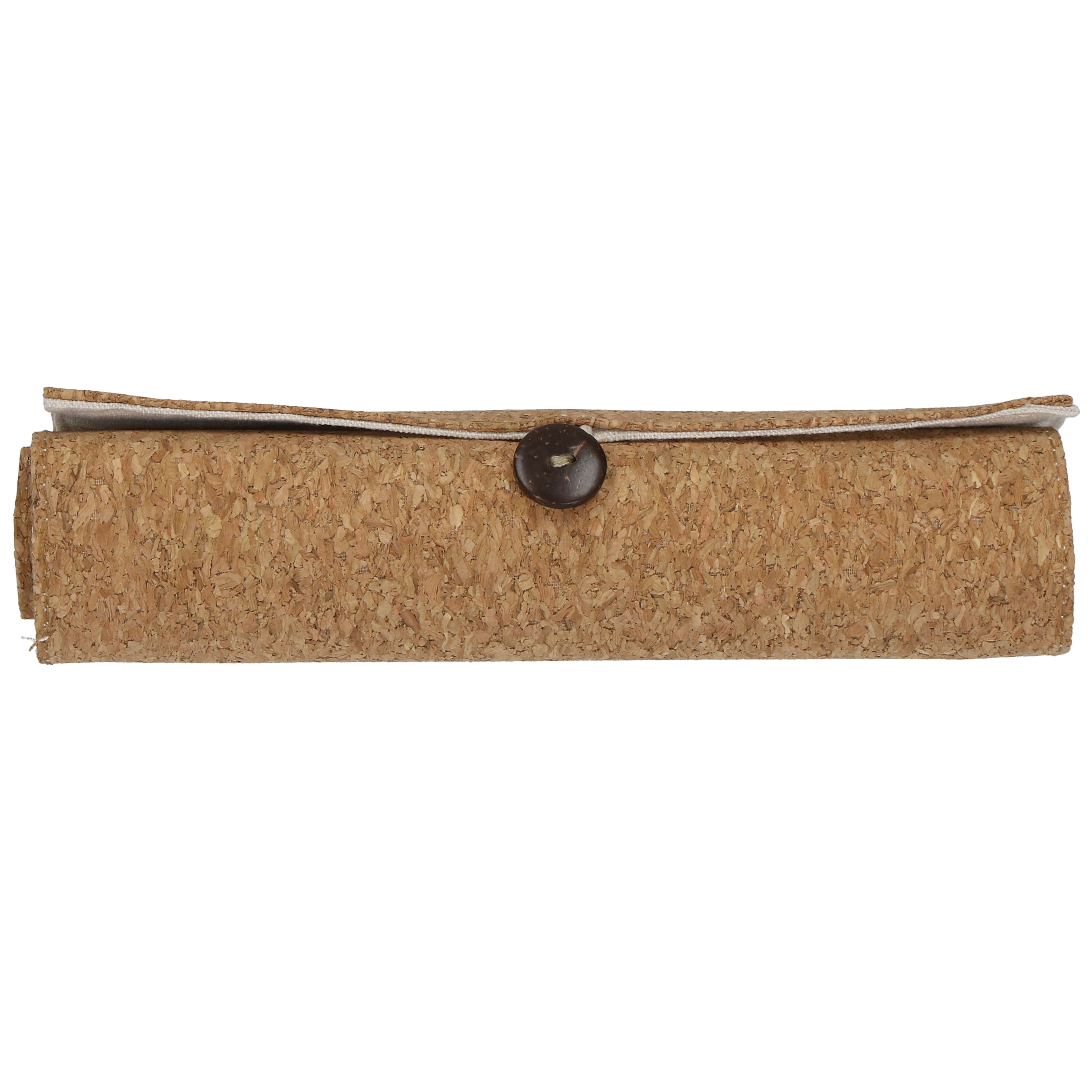 Flexibler Kork. Stifte-Rolle mit Naturkork bezogen. Die Innenseite ist aus leinenfarbenem Textil und beinhaltet einen Radiergummi, einen Spitzer, ein Holzlineal und 12 Buntstifte aus naturbelassenem Holz. Der Überschlag verhindert ein Herausfallen von Utensilien. Verschlossen wird die Rolle mittels Knopf und Gummischlaufe.