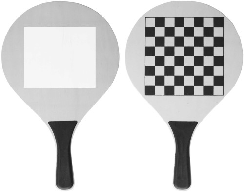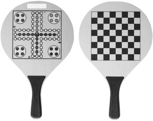 Strandspiel aus Holz mit Ludo- und Schachbrett, inklusive Spielsteinen, Spielball und Nylonhülle.