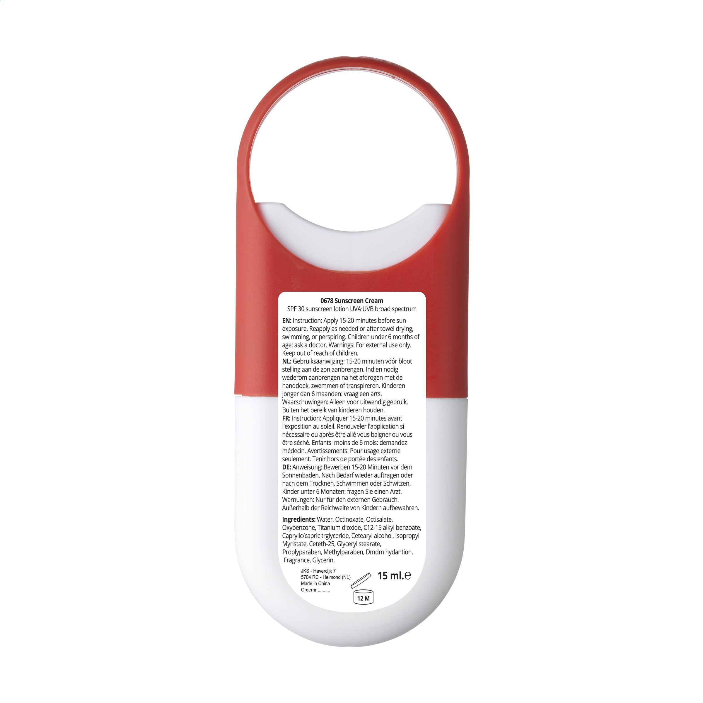 Sonnenschutzlotion (Faktor 30) in handlicher, Kunststoff-Sprühflasche mit Zerstäuber und Aufhängeauge. Mindesthaltbarkeit bis zu 12 Monate nach dem Öffnen. Inhalt 15 ml. Zutaten: aqua, Octinoxate, Octisalate, Oxybenzone, Titanium dioxide, C12-15 alkyl benzoate, Caprylic/capric triglyceride, Cetearyl alcohol, Isopropyl Myristate, Ceteth-25, Glyceryl stearate, Proplyparaben, Methylparaben, Dmdm hydantoin, Fragrance, Glycerin.