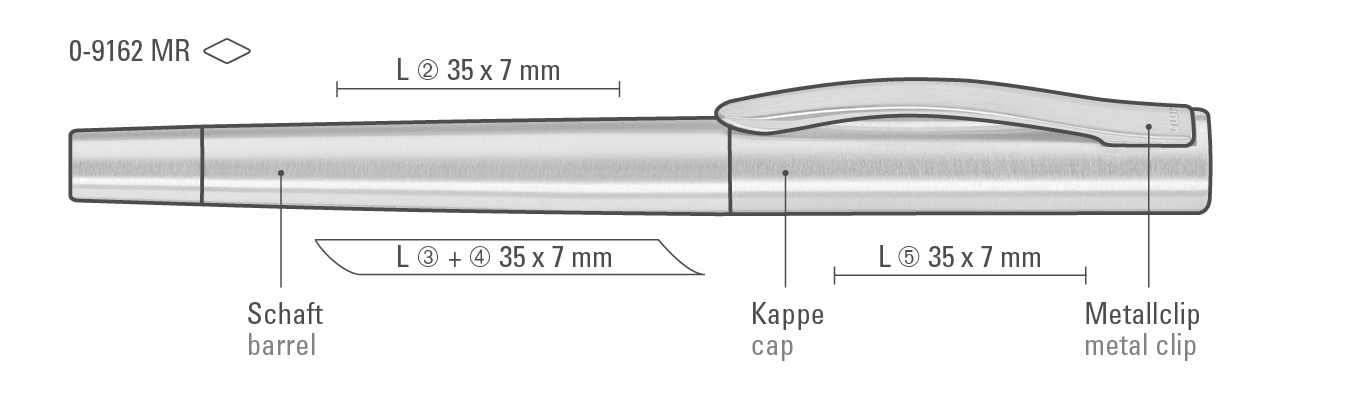 in Clipverlängerung 35mm x 7mm Lasergravur (L), gegenüber vom Clip 35mm x 7mm Lasergravur (L), seitlich vom Clip 35mm x 7mm Lasergravur (L), auf der Kappe/auf dem Oberteil 35mm x 7mm Lasergravur (L), in Clipverlängerung 35mm x 7mm Einzelnamensgravur (EL), gegenüber vom Clip 35mm x 7mm Einzelnamensgravur (EL), seitlich vom Clip 35mm x 7mm Einzelnamensgravur (EL), auf der Kappe/auf dem Oberteil 35mm x 7mm Einzelnamensgravur (EL)
