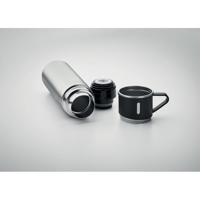 Set bestehend aus doppelwandiger Isolierflasche sowie 1 passenden Becher. Der Becher kann als Deckel genutzt werden. Edelstahl. Füllmenge: Flasche 420 ml, Becher 150 ml.
