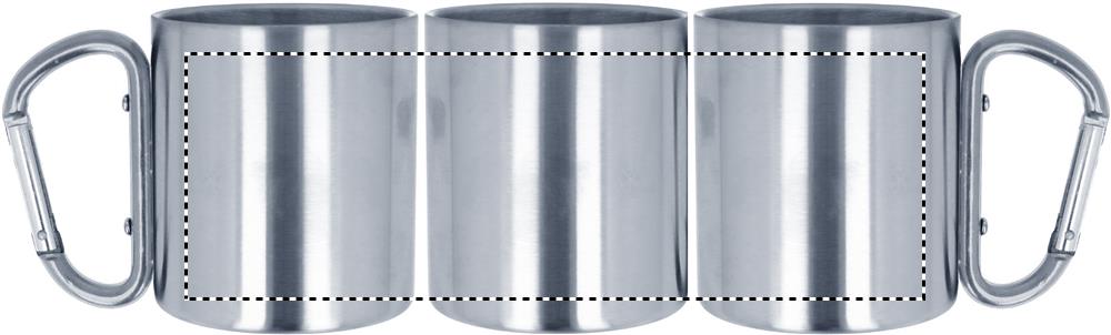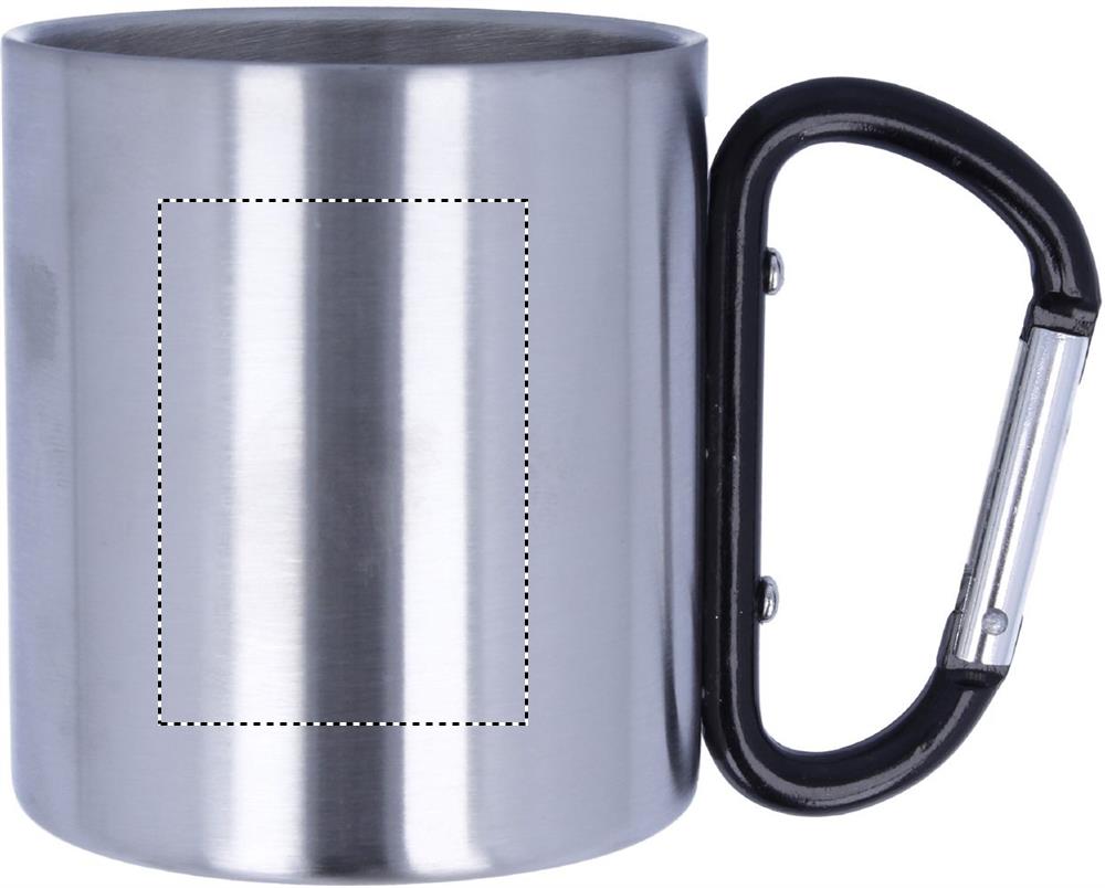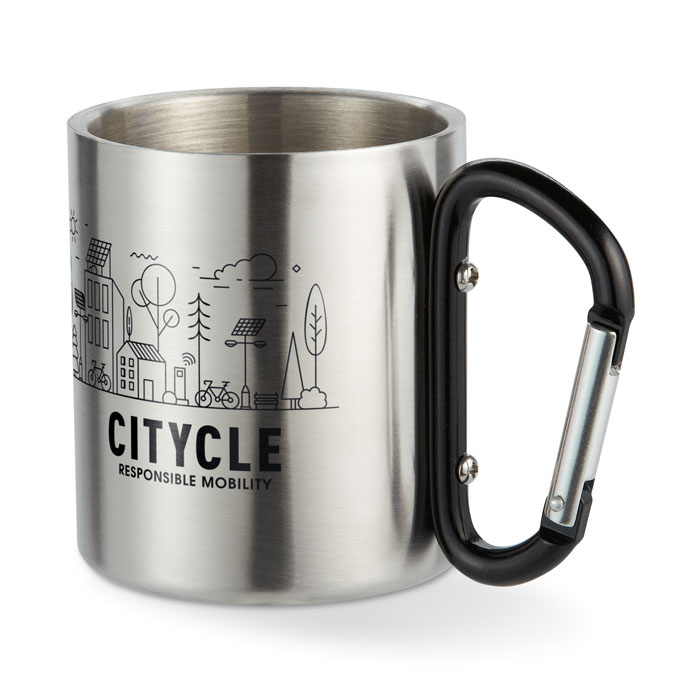 Doppelwandiger Trinkbecher aus Edelstahl. Henkel mit Karabiner. Füllmenge: 220 ml. Der Karabiner ist NICHT als Sicherung beim Klettern geeignet.