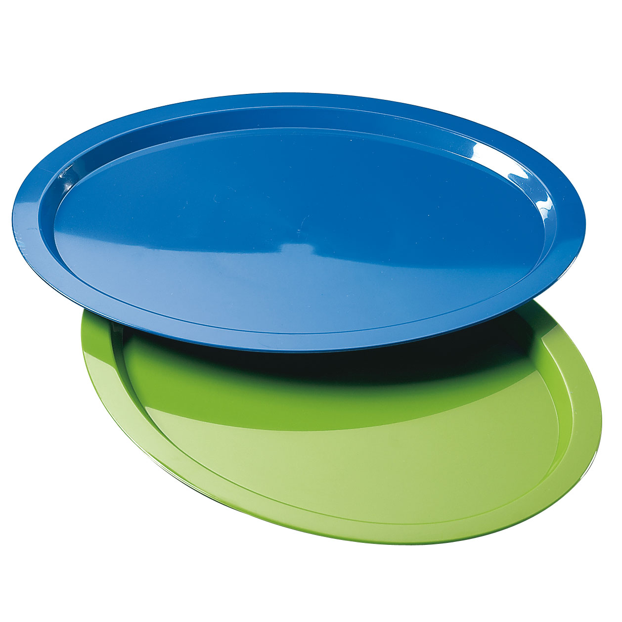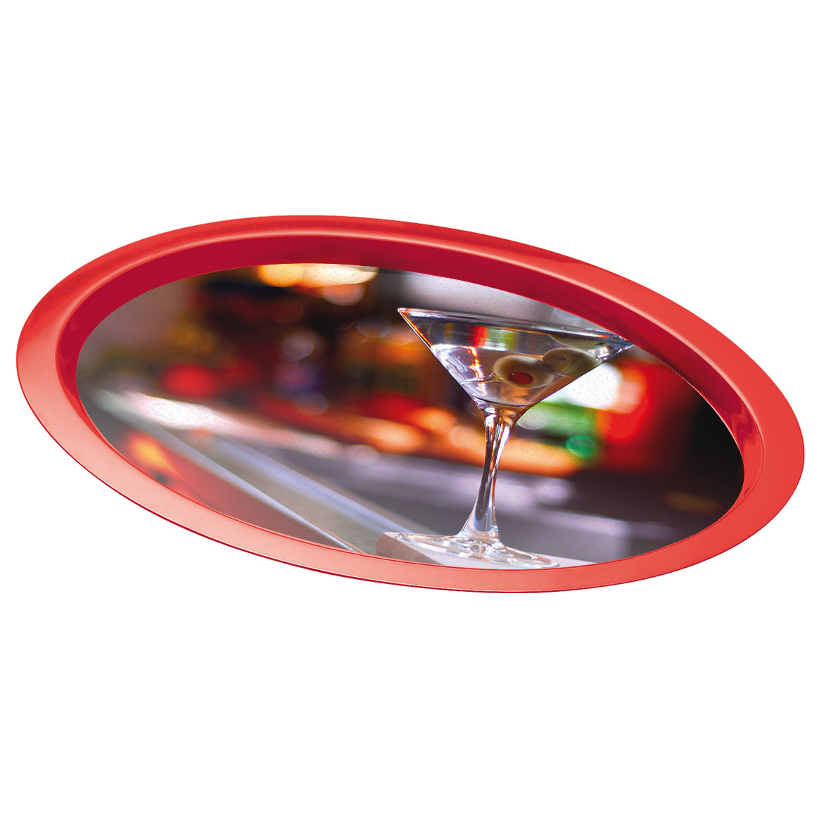 Ovales Tablett aus stabilem Kunststoff mit großer Werbefläche und niedrigem Rand zur besseren Handhabung. Besonders geeignet zum Servieren von Kaffee oder Tee.