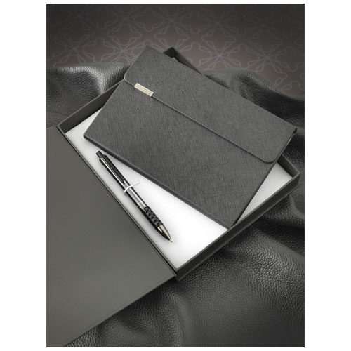 Notizbuch in exklusivem Design (A5-Referenz) mit Thermo-PU-Einband, schwarzem Band-Lesezeichen, Magnetverschluss und 80 Blatt (80 g/m2) cremefarbenem, liniertem Papier. Gepaart mit dem Tactical Druckkugelschreiber. Beide Artikel sind in einer „LUXE“-Präsentschachtel verpackt. Größe des Notizbuches: 13,5 x 20,5 cm. Länge des Stiftes: 14 cm. Durchmesser des Stiftes: 1,05 cm.