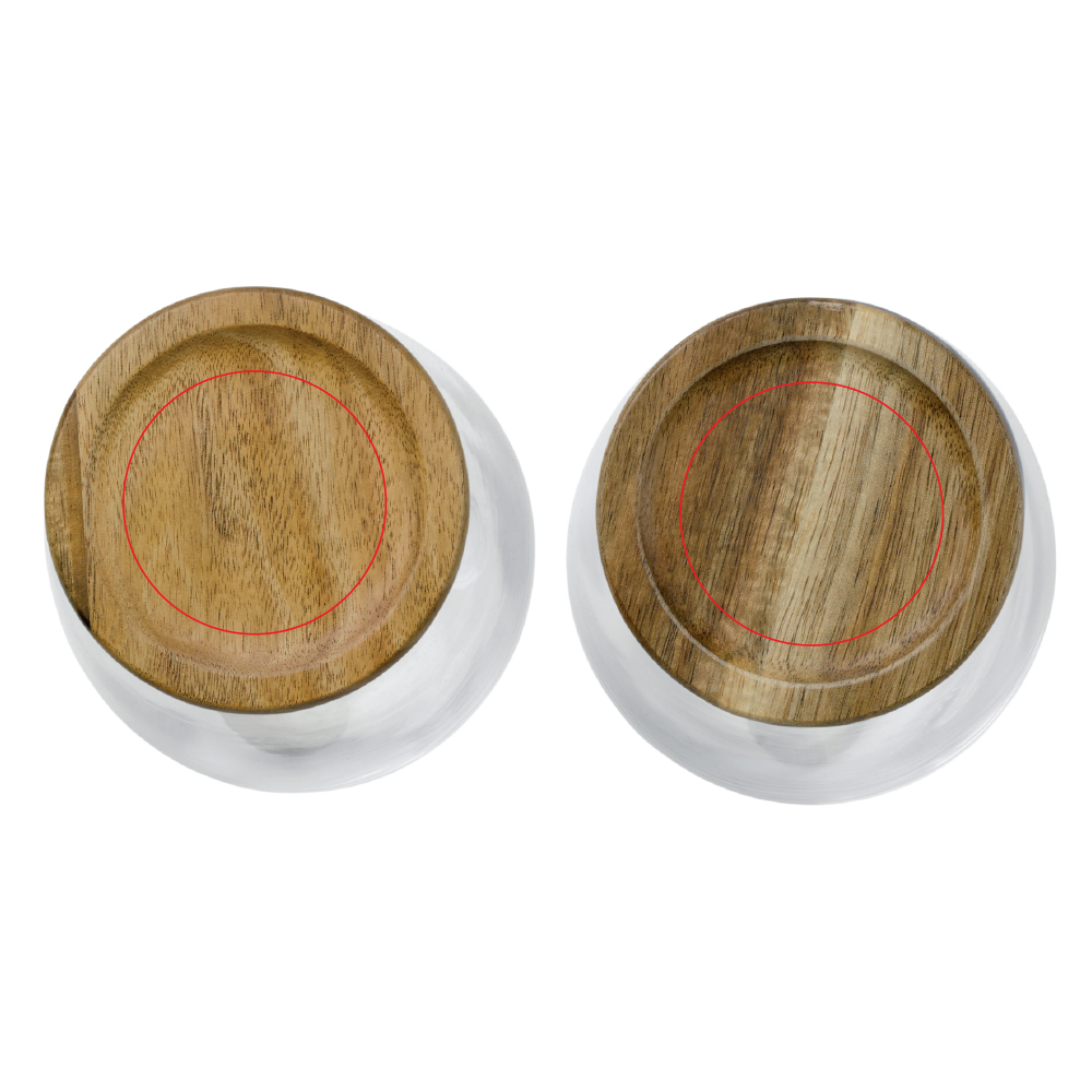 Set mit 2 Gläsern und Deckeln aus Akazienholz. Schützt Ihre Getränke und Sie können Ihre Häppchen darauf ablegen. Verpackt in einer Geschenkbox.