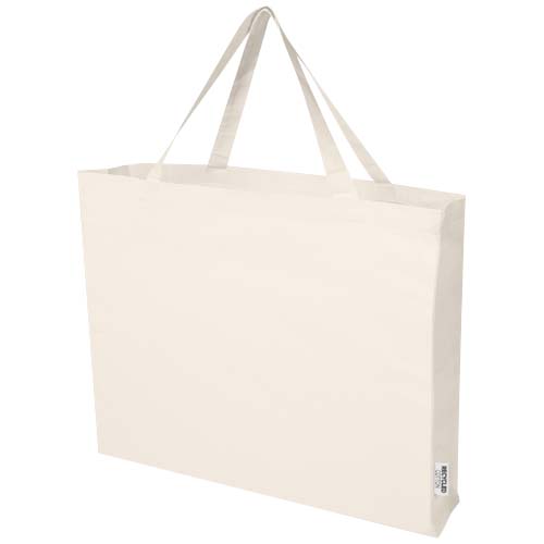 Die Florida Tragetasche mit Seitenfalten wird aus 100 % GRS-zertifizierter, Recyclingbaumwolle mit einem Gewicht von 270 g/m² hergestellt und ist eine verantwortungsbewusste und nachhaltige Wahl für den täglichen Bedarf. Mit einem Fassungsvermögen von bis zu 14 Litern und 30 cm langen Griffen ist sie ideal für den mühelosen Transport von Lebensmitteln, Büchern oder Alltagsgegenständen.