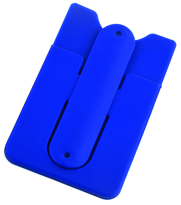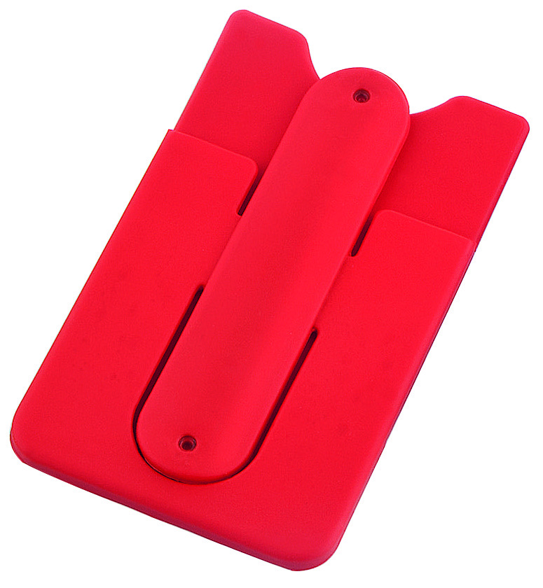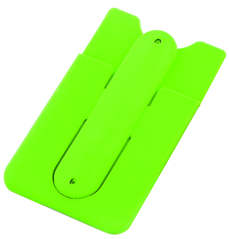 Intelligenter Kartenorganizer aus Silikon mit Aufstellfunktion für das Smartphone. Original 3M® wiederablösbare Klebefläche, VPE 600. Polybeutel, Design-Infokarte