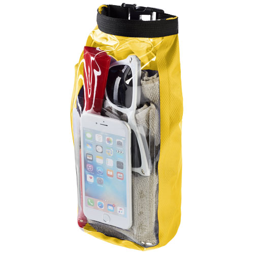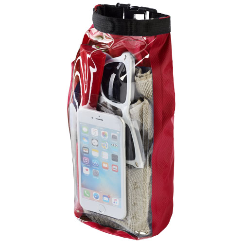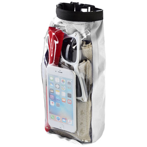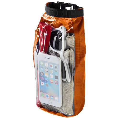 Tourist 2 l wasserdichte Outdoor-Tasche mit Telefonhülle. Eine wasserdichte Tasche, die großartige für die Aktivitäten im Freien geeignet ist. Der Rolltop-Verschluss mit Kunststoffschnalle stellt die trockene und sichere Aufbewahrung von Wertsachen sicher. Ein transparentes Fenster ermöglicht den Zugriff auf das Gerät während der Aufbewahrung. Kann problemlos an einer Tasche oder einem Gürtel befestigt werden. Heruntergerollt und verschlossen beträgt das Fassungsvermögen 2 Liter. 190T Polyester.