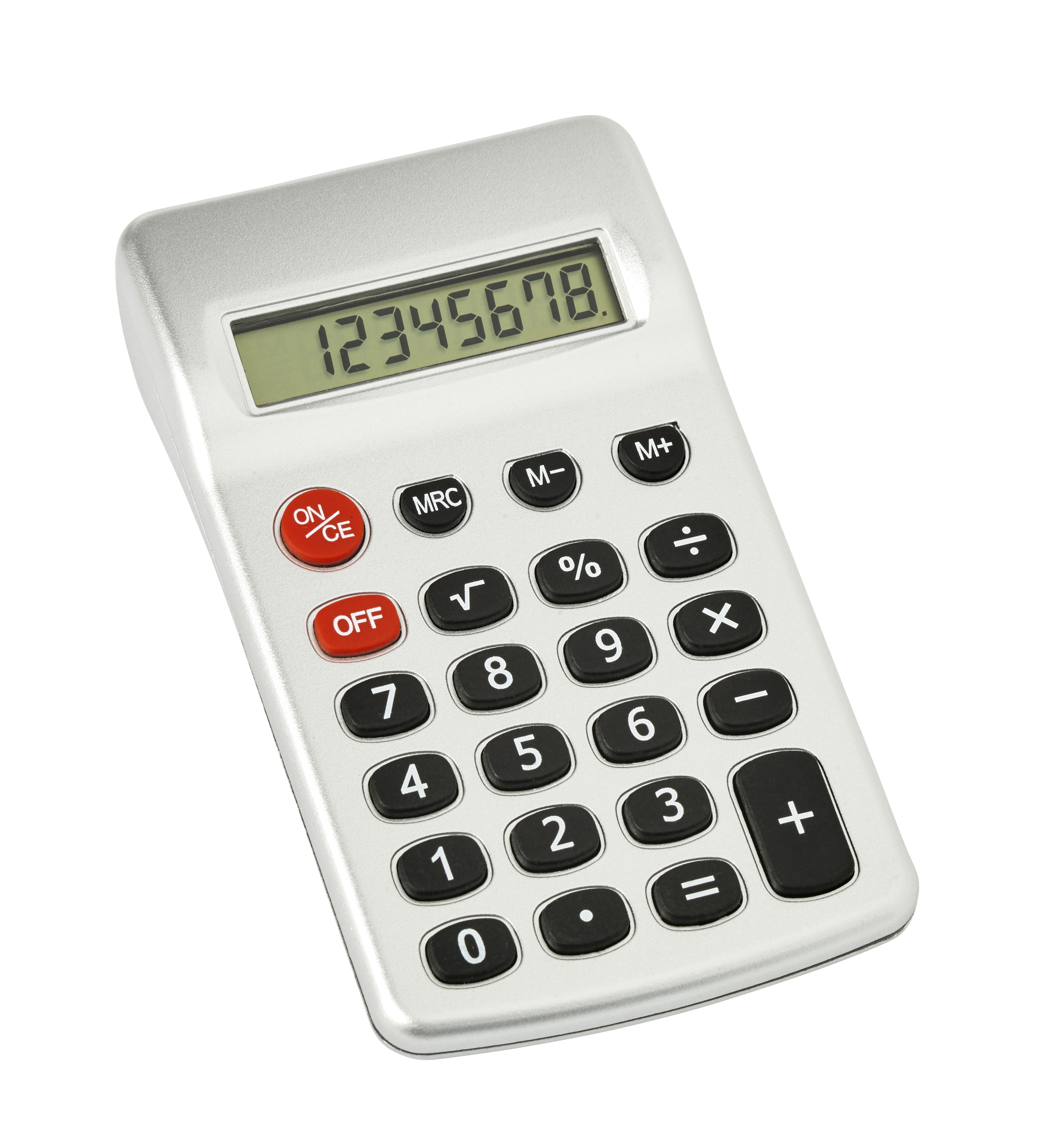 Taschenrechner aus Kunststoff, 8 Ziffern, mit gummierten Tasten.
