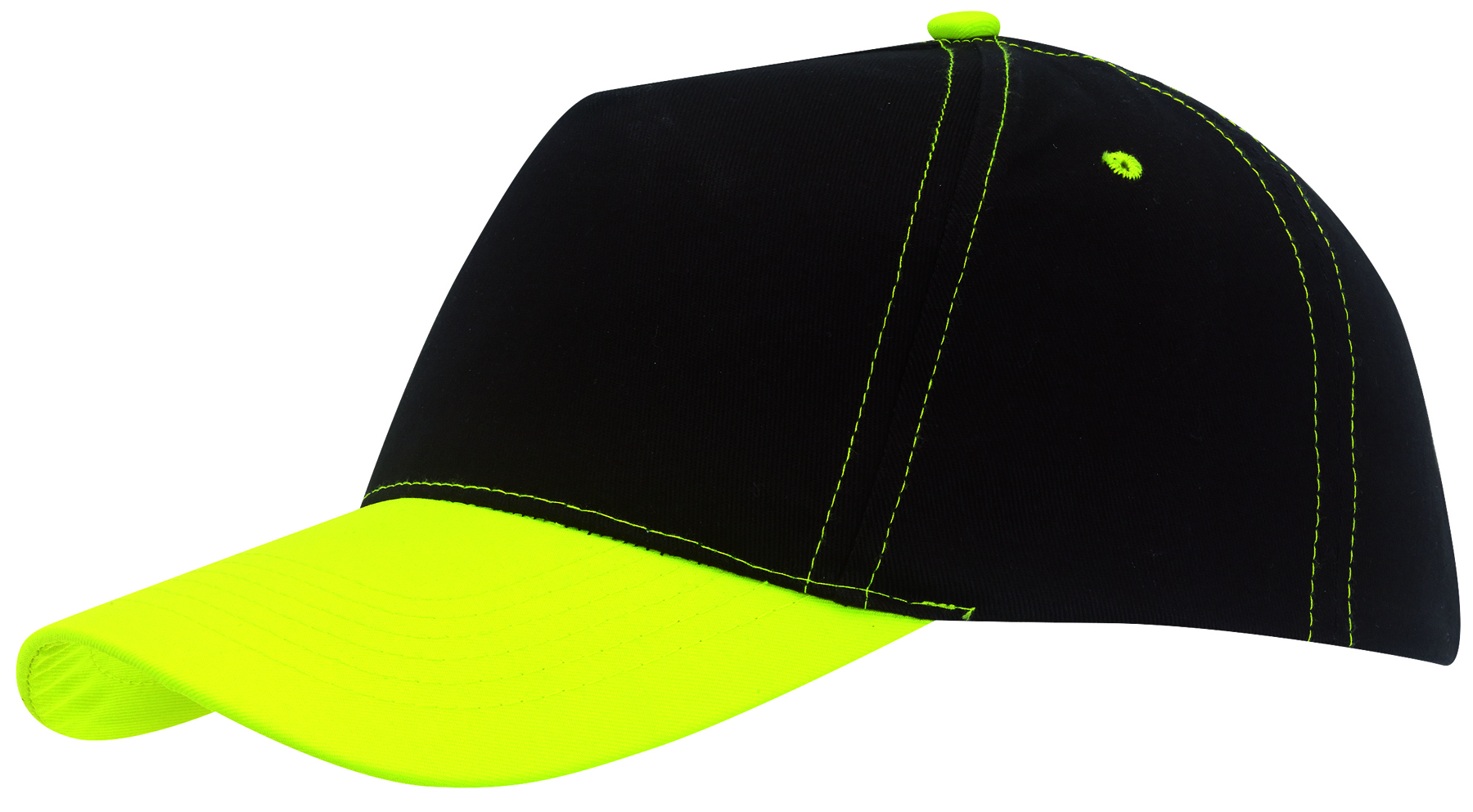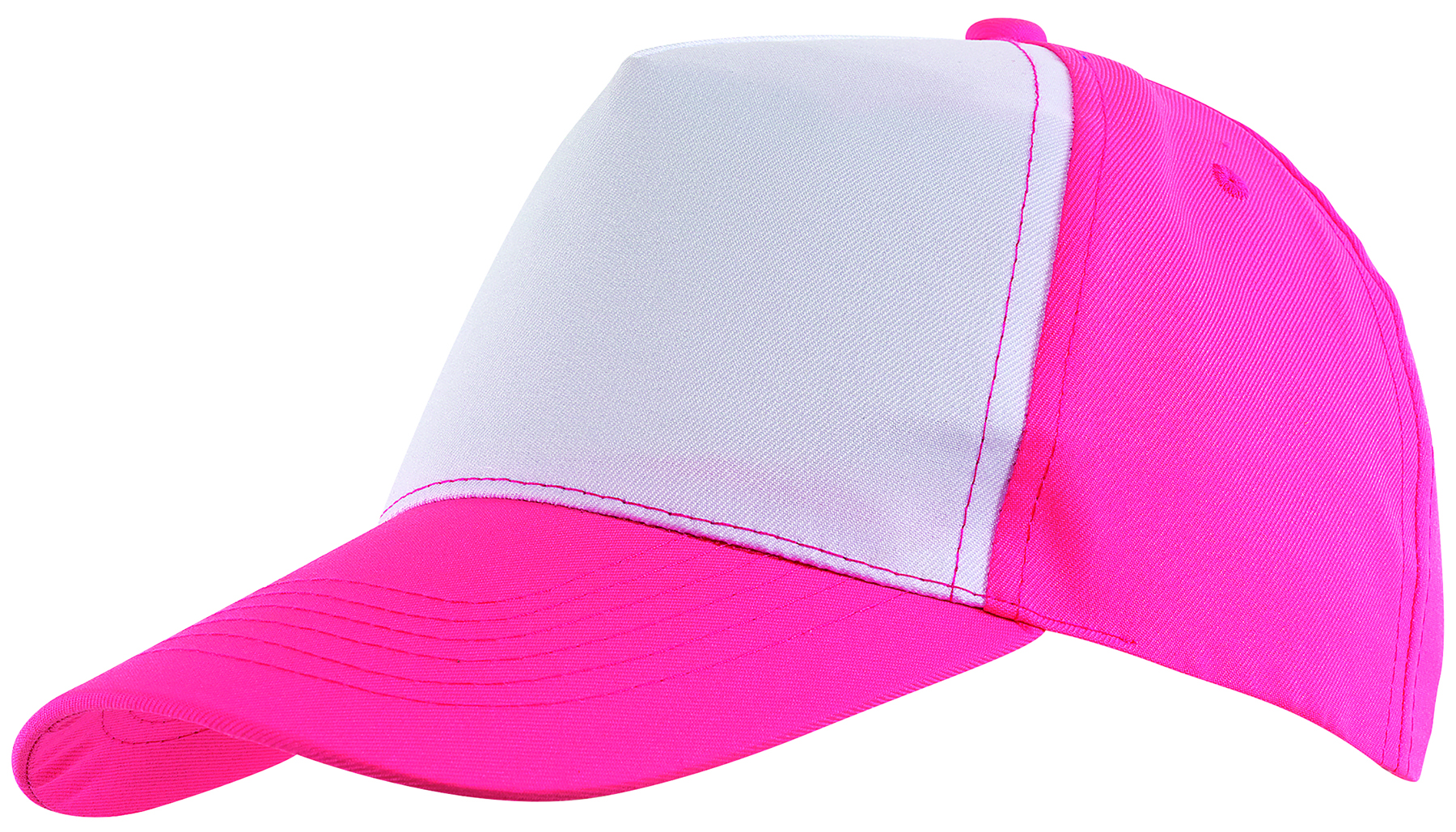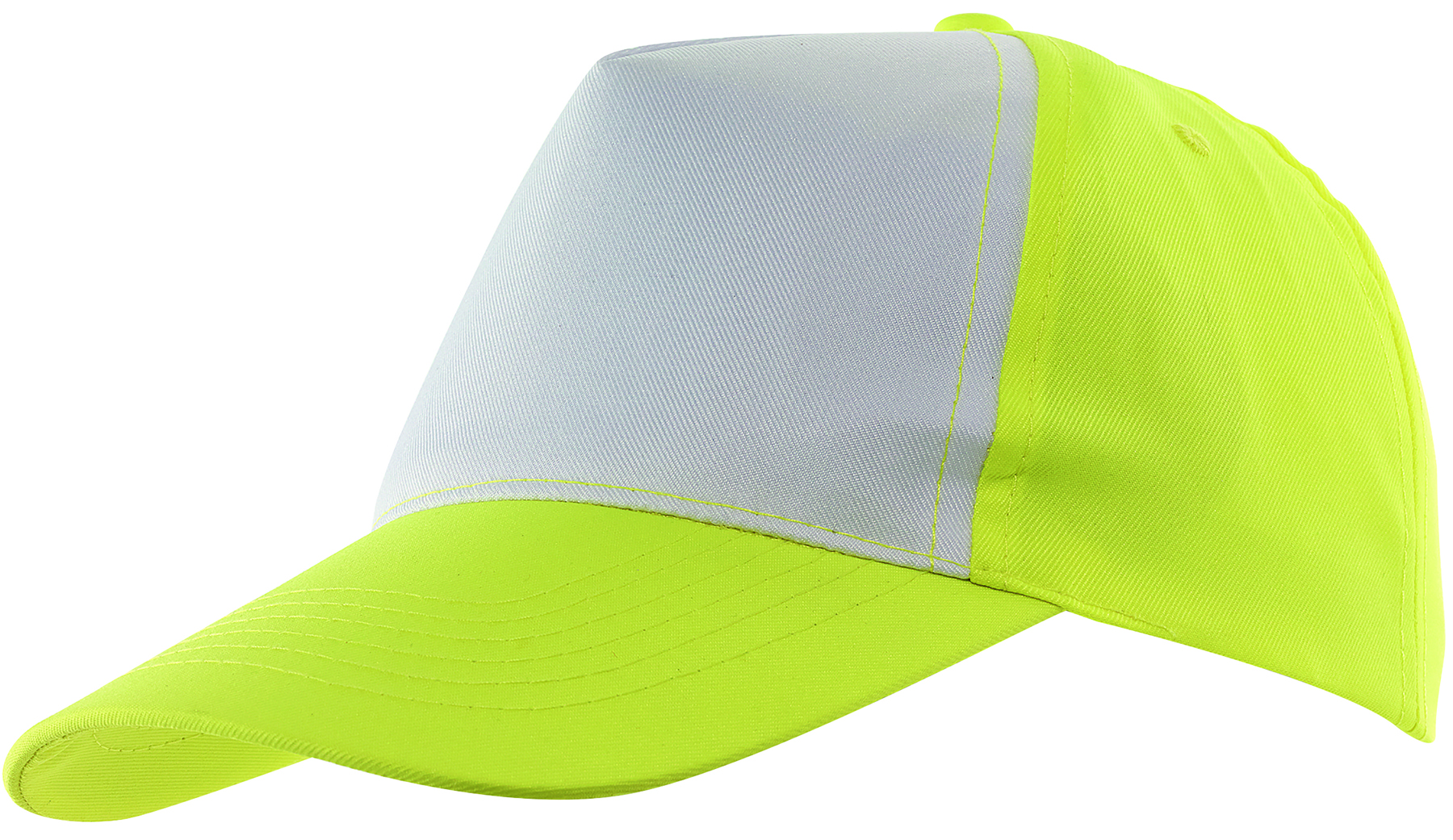 5-Panel-Baseball-Cap SPORTSMAN : gut zu bedruckendes verstärktes Frontsegment – Visier, 4 gestickte Luftlöcher, Nähte sowie Knopf in Neonfarben – größenverstellbarer Klettverschluss am Hinterkopf