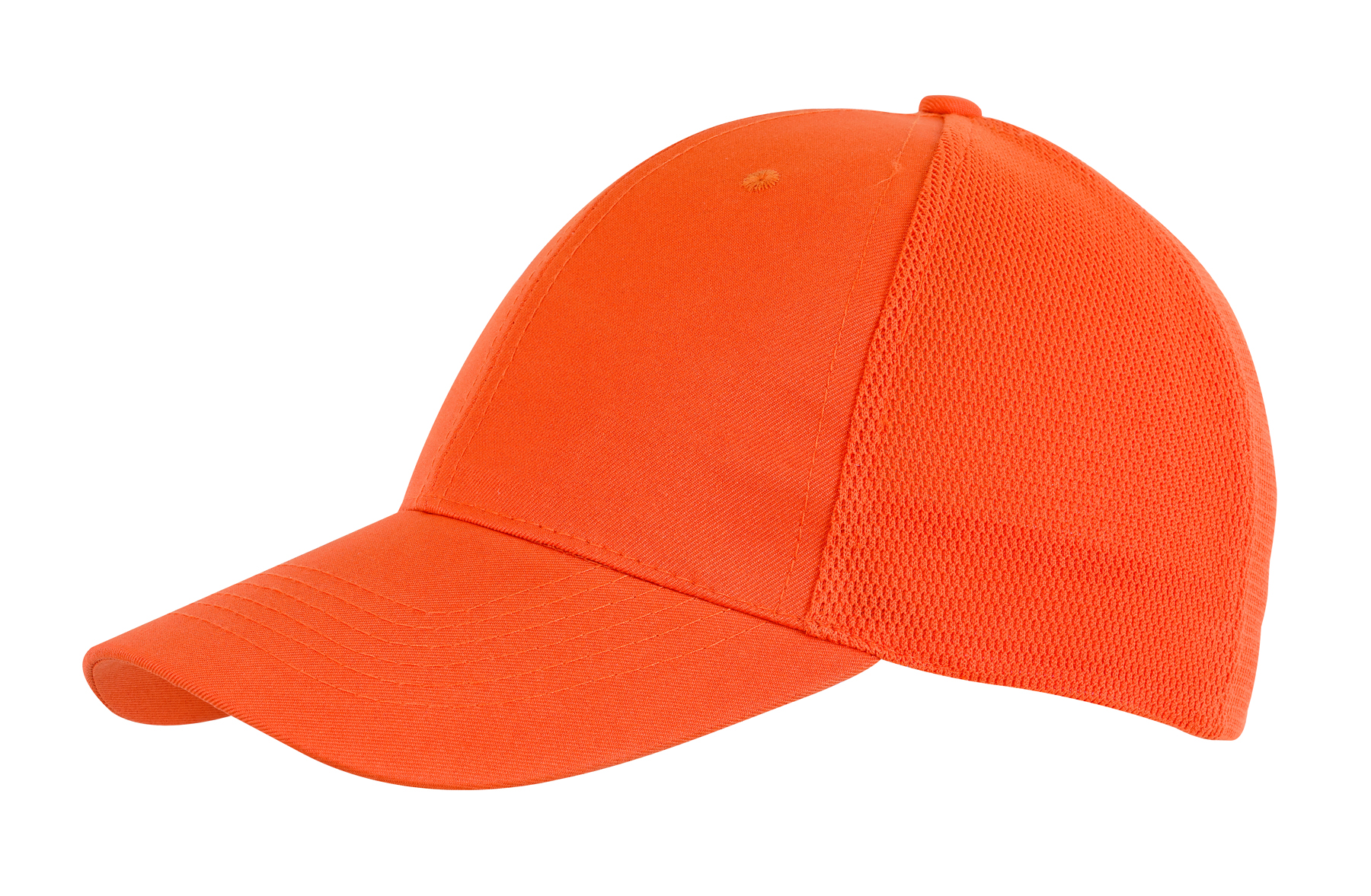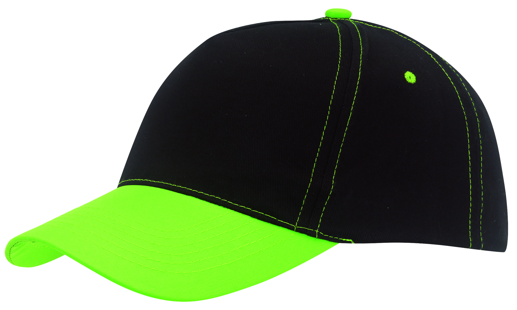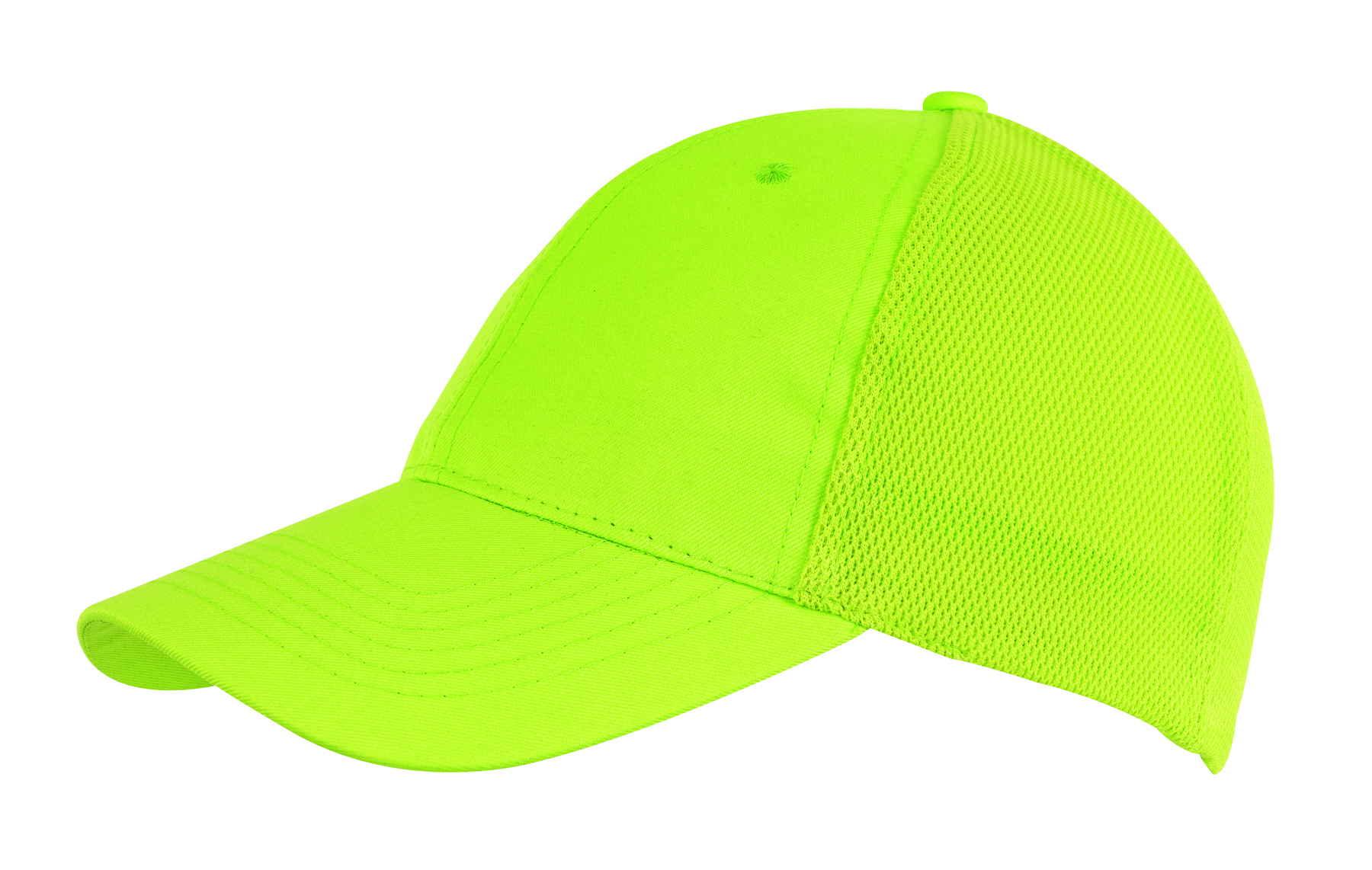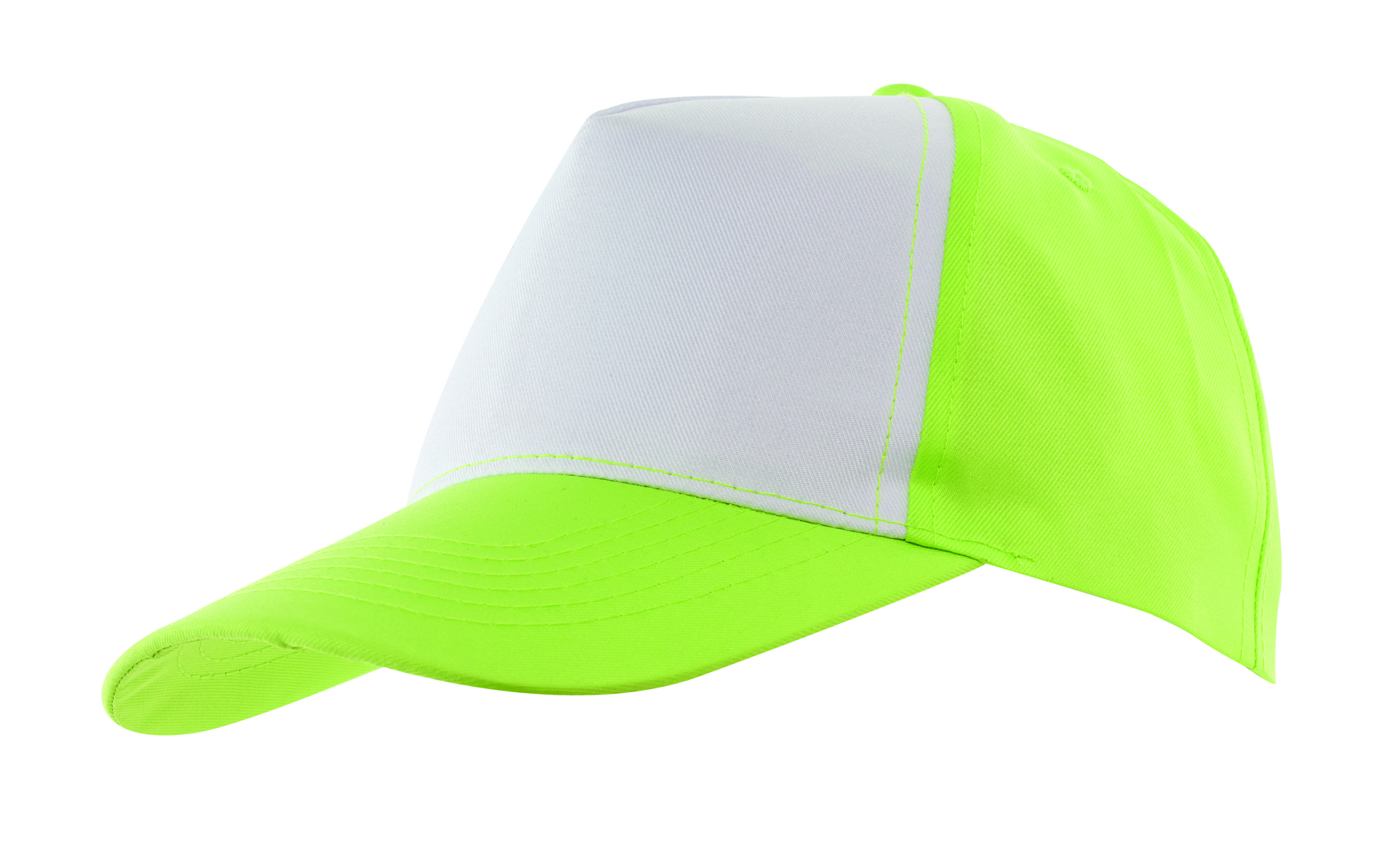 5-Panel-Baseball-Cap SPORTSMAN : gut zu bedruckendes verstärktes Frontsegment – Visier, 4 gestickte Luftlöcher, Nähte sowie Knopf in Neonfarben – größenverstellbarer Klettverschluss am Hinterkopf