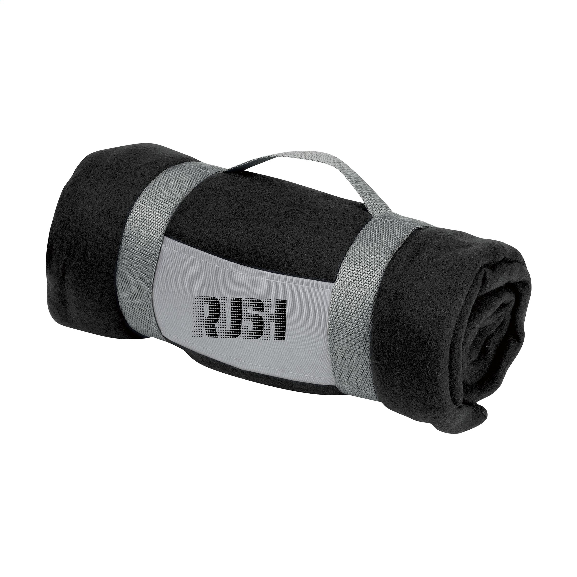 Große kuschelige und wärmende Fleecedecke mit praktischer Tragebanderole und schöner Ziernaht um den Rand. Ihre Werbung drucken wir auf die schwarze Banderole.