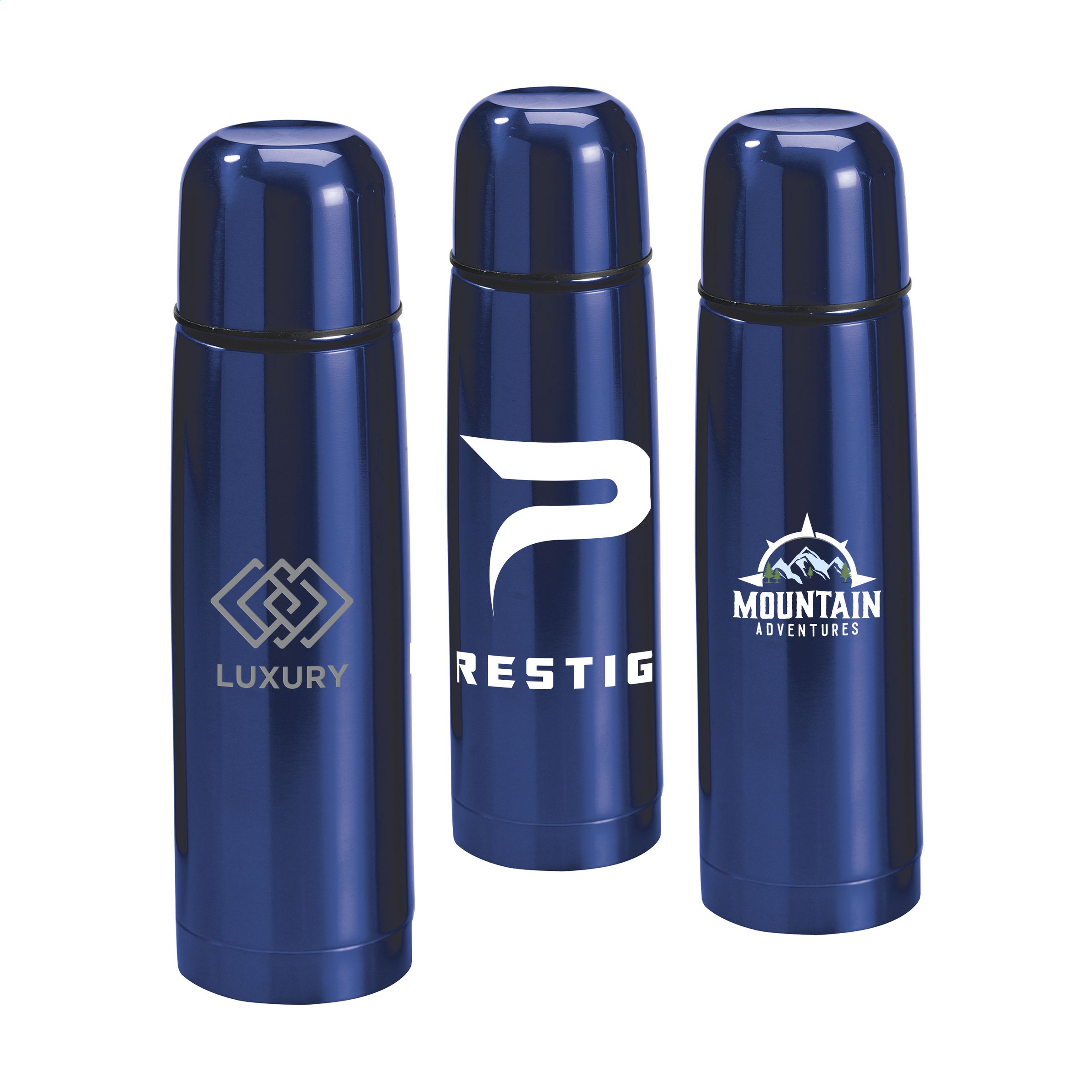 Doppelwandige Isolierflasche mit Becher im Deckel. Ausgießer mit Einhand-Druckknopf, der sich automatisch schließt, wenn der Deckel auf die Flasche geschraubt wird. Volumen 750 ml.