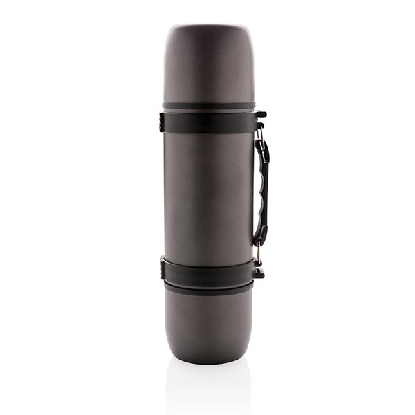 Doppelwandiger Stainless-Steel Thermosflasche in elegantem Design mit Griff und Schultergurt sowie 2 passenden Tassen. Auslaufsicher, nur Handwäsche. Inhalt: 700ml.