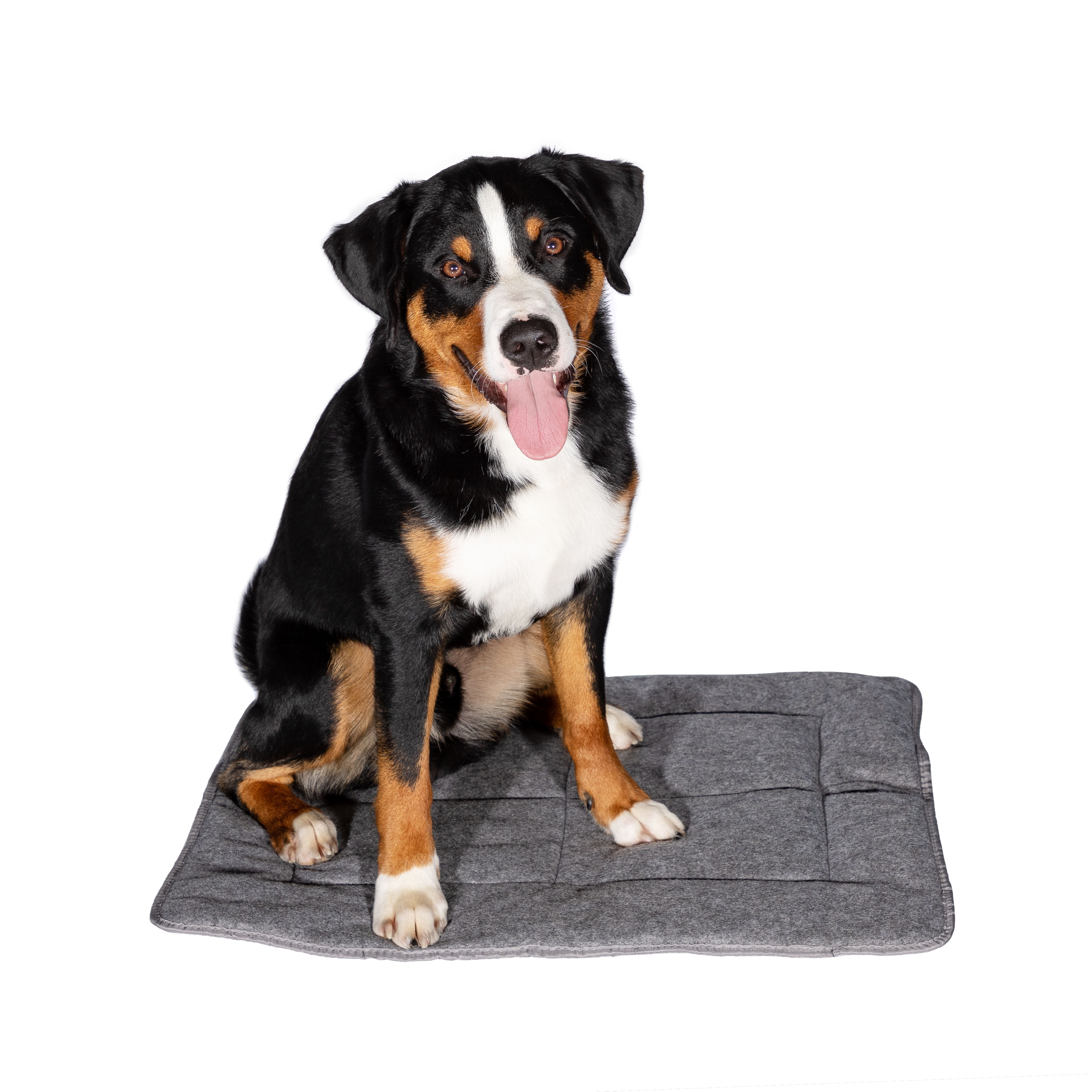 Bequemer Liegeplatz im Kofferraum und unterwegs. Zweifarbige, gesteppte Tierreisedecke mit Polyesterwatte gefüllt. Sowohl auf der Unter- wie auch auf der Oberseite veredelbar.