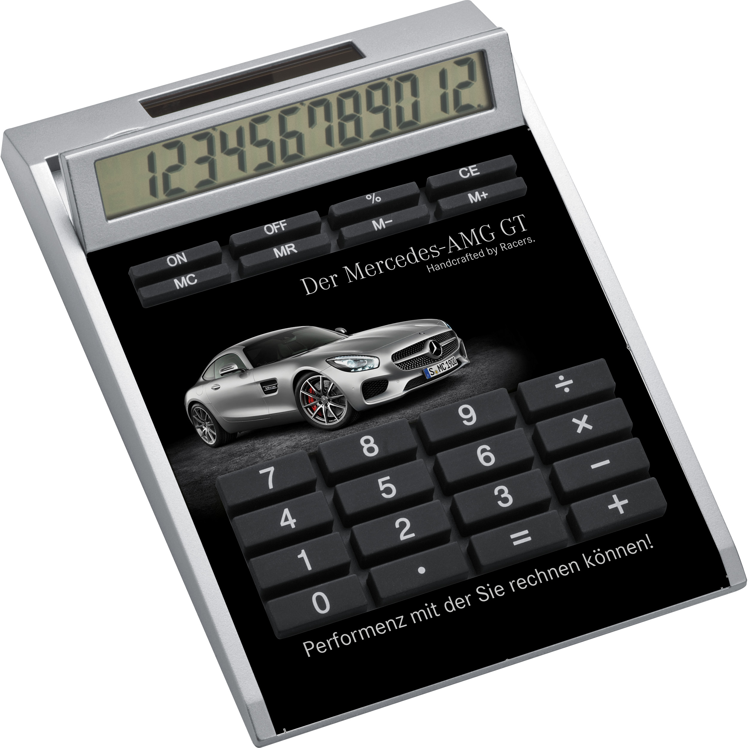 CrisMa Design-Taschenrechner mit 12 Digits und Solar Power aus silbernem Kunststoff. Einzigartig ist die digital bedruckbare Fläche. So einfach kann Ihre Printkampagne auf einem Werbeartikel umgesetzt werden.