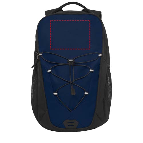 Eine Mischung aus Outdoor- und Alltagsrucksack aus farbigem Stoff und elastischer Kordel mit reflektierenden Akzenten auf der Vorderseite. Ausgestattet mit zwei Netz-Außentaschen für Wasserflaschen, einem Frontfach mit mehreren kleinen Fächern, einem Haken und einer 12-Zoll-Tablethülle. Der Rucksack hat einen gepolsterten, verstärkten Griff und eine bequeme, gepolsterte Rückseite. Geeignet für einen 15,6-Zoll-Laptop in einer gepolsterten Hülle im Hauptfach.