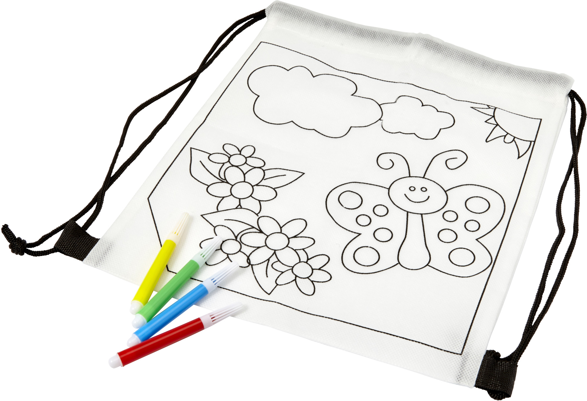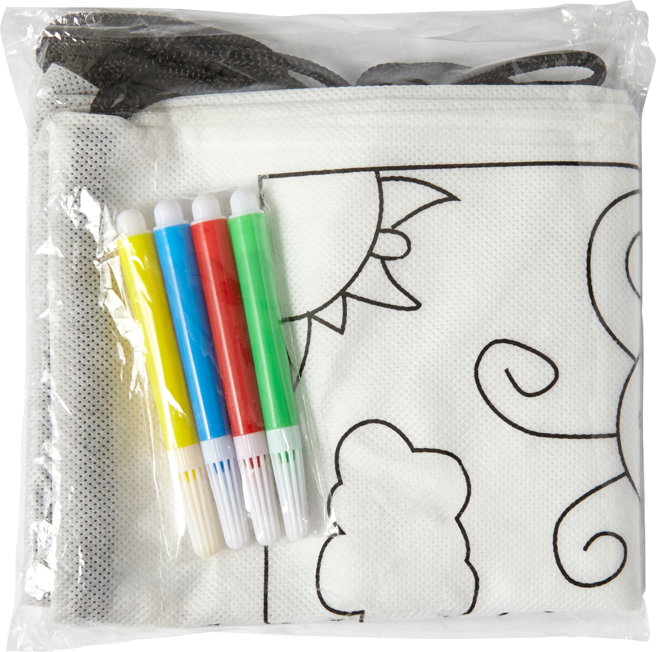 Turnbeutel aus Polyester, mit Schultergurten aus Kordeln, 4 Filzstiften (Rot, Gelb, Grün, Blau) zum Ausmalen des Bildes auf der Vorderseite.